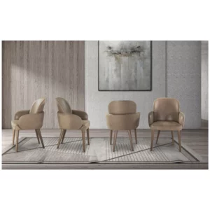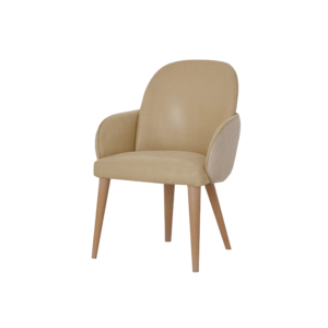 The Abbie Carver features a padded, curved wood back that gently wraps around the backrest, creating a supportive and enveloping form. The inner back and seat are smooth, while the exterior upholstery in a lizard-pattern eco-nubuck adds subtle texture and interest. The chair’s sculpted silhouette, paired with angled, stained wooden legs, offers a harmonious balance of modernity and classic luxury.