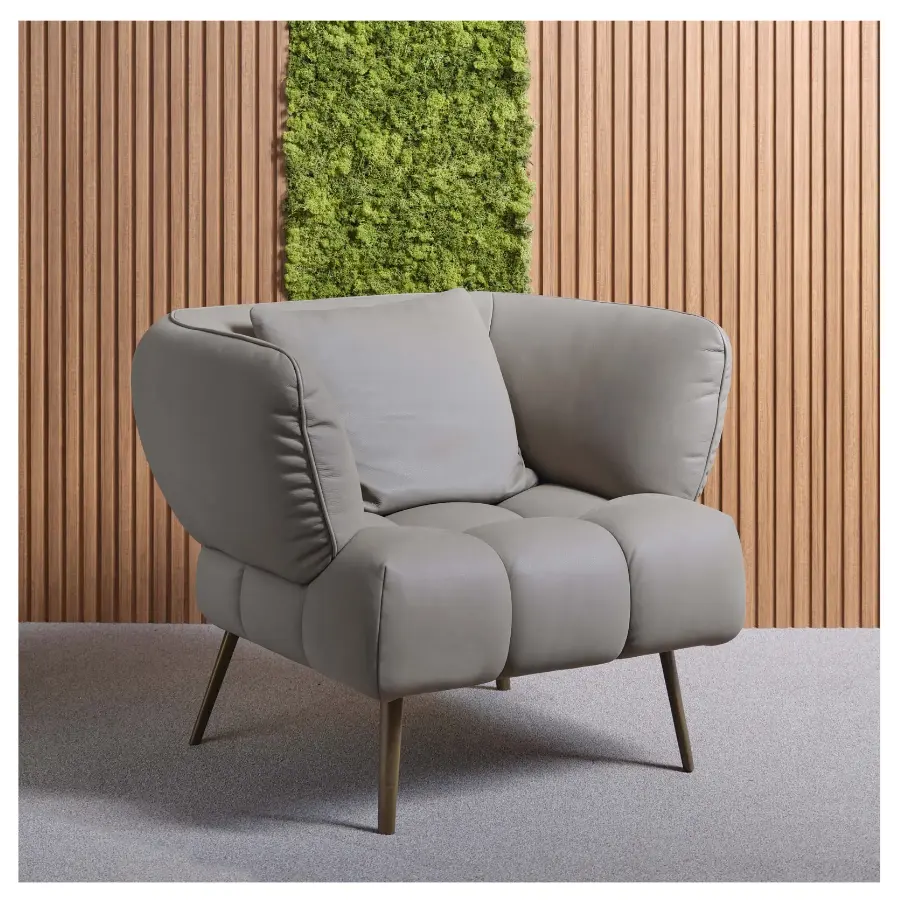 This armchair features a generous, softly contoured seat and back, beautifully upholstered in smooth dove-grey leather. The deeply padded, tufted seat, gently wraparound arms, and extremely well made lumbar design offer superb comfort and ergonomic support. Set on tapered, understated wooden legs, the Abbracci projects a light yet grounded presence—perfect for both statement and supporting roles in living rooms, offices, or lounge areas. Seamless seams and rich leather characterize its hallmark Italian craftsmanship, making it a luxurious spot for relaxing or reading.