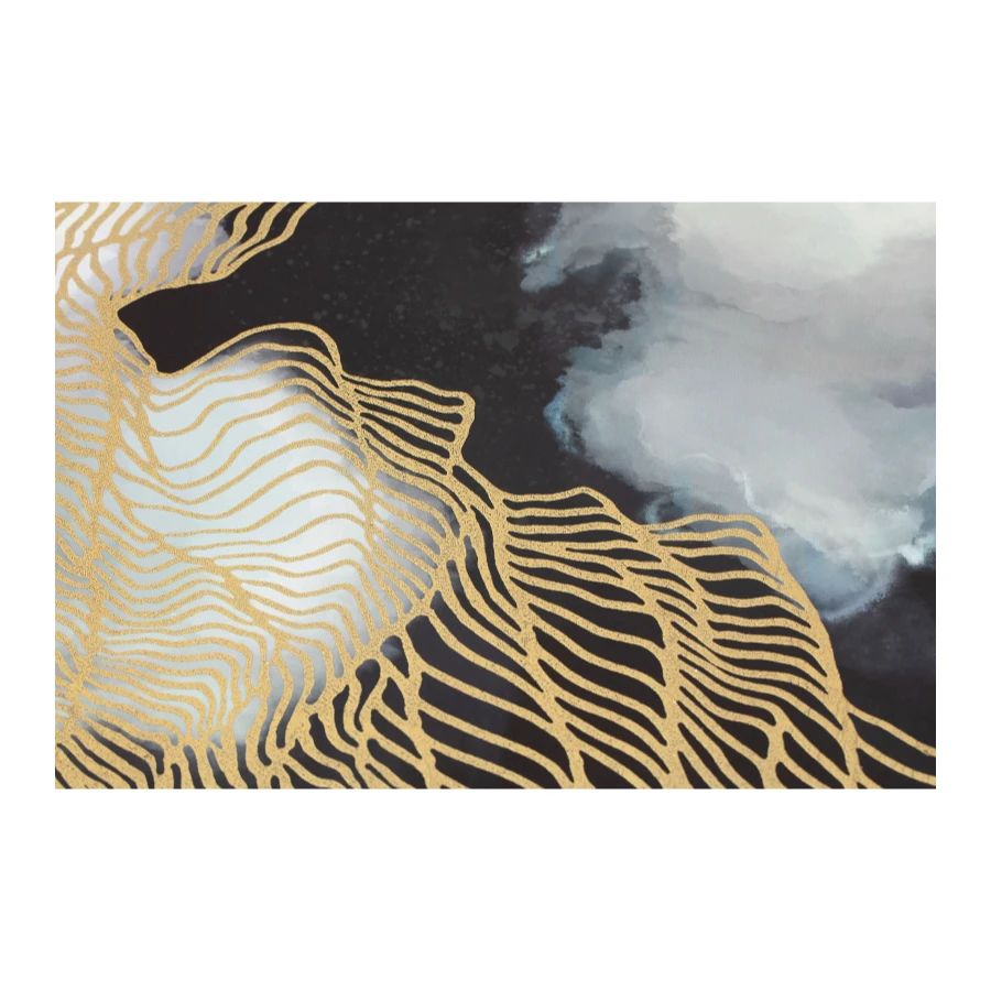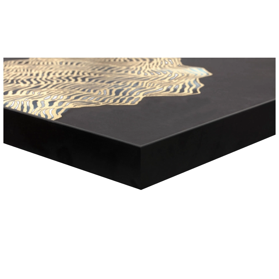 Large abstract artwork. Printed canvas with matt black frame and machined gold ofil print design.