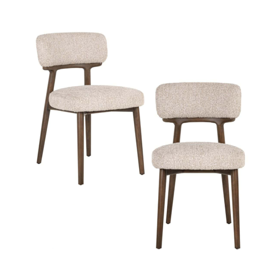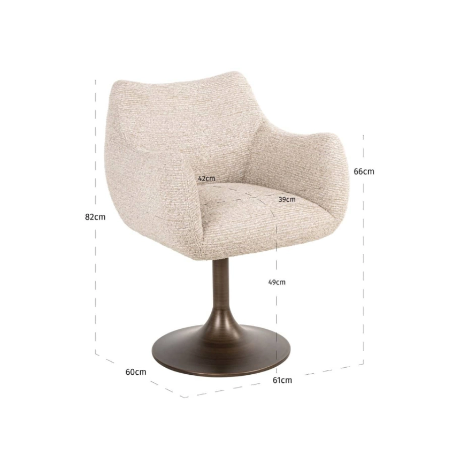 The organically shaped seat provides perfect support for both your back and arms, while the subtle woven texture of the tweed fabric gives it a stylish and luxurious look. Thanks to the sturdy metal base with a timeless bronze finish, the chair is not only stable, but also forms a chic and harmonious combination with the warm brown tones of the fabric. Whether you use it at the dining table, in the living room, or as a statement piece in a cozy corner, this chair exudes quality, comfort, and sophistication.