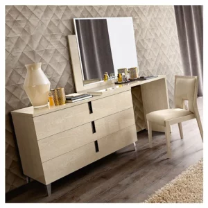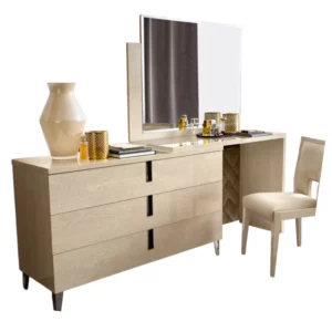The Ambra large vanity dressing table showcases a harmonious contrast between the glossy birch finish and deep glossy handles.