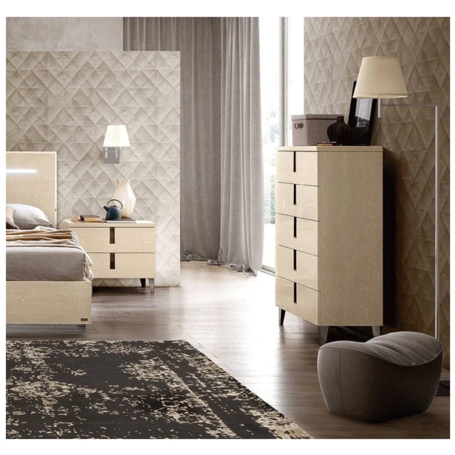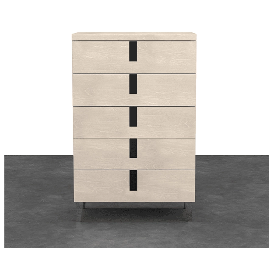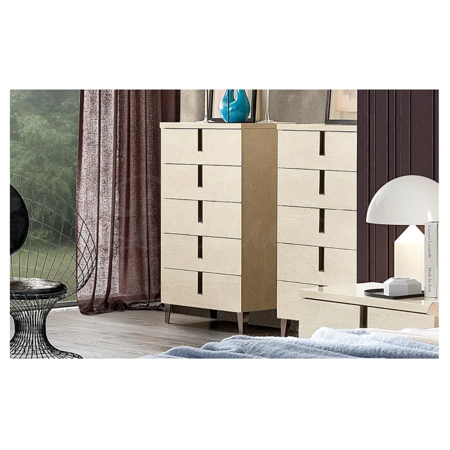 The Ambra Tall Chest of Drawers is a sophisticated Italian-made storage unit known for its elegant sand birch wood finish and modern, high-gloss design. It features five spacious drawers with soft-closing mechanisms and high-resistance nickel black finish handles, blending both luxury and function for contemporary bedrooms.