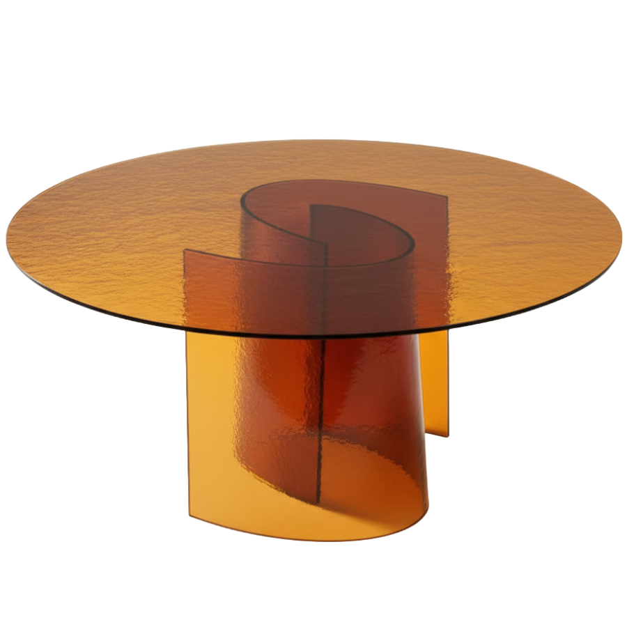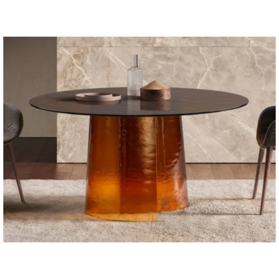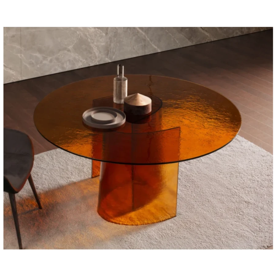The Martellato Ambra glass top offers durability while serving as a luxurious, artful surface for dining.