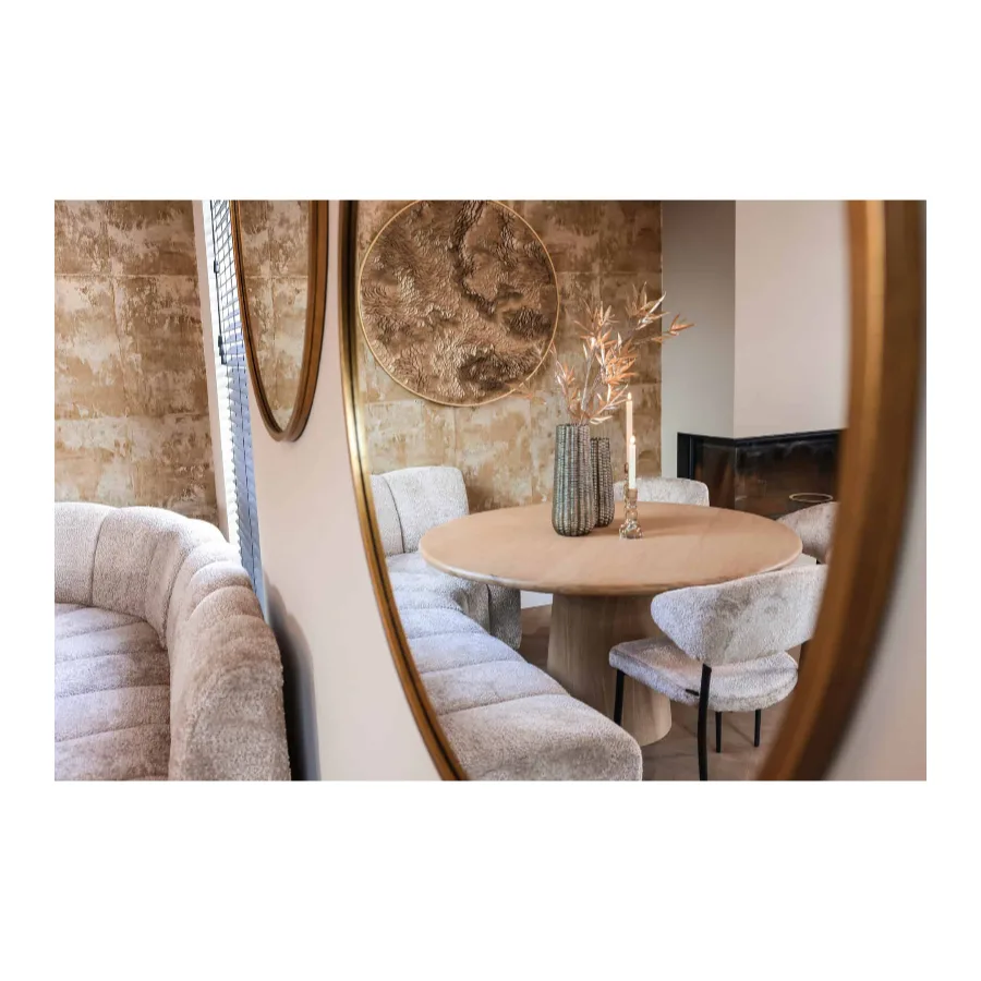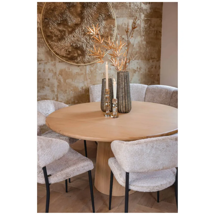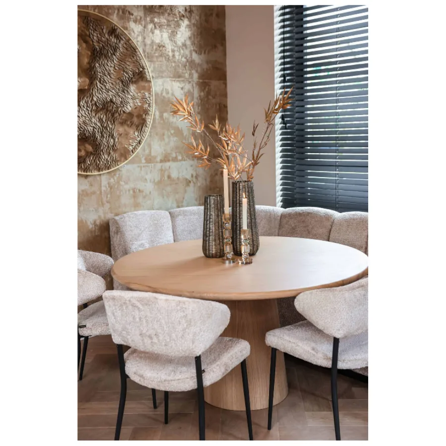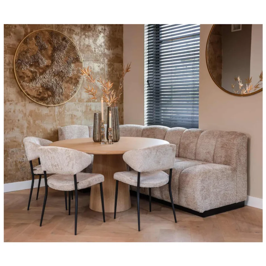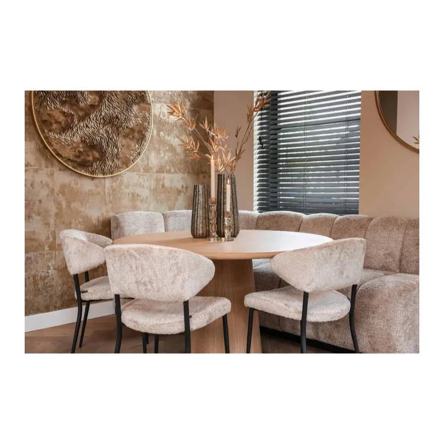 The Bea chair, available in a set of two, combines elegance and comfort through its fabric: Sheep Nature. This fabric adds a touch of elegance to any interior with its soft, neutral tone, and also, known for its warm and natural appearance, brings a rustic and cozy feel.