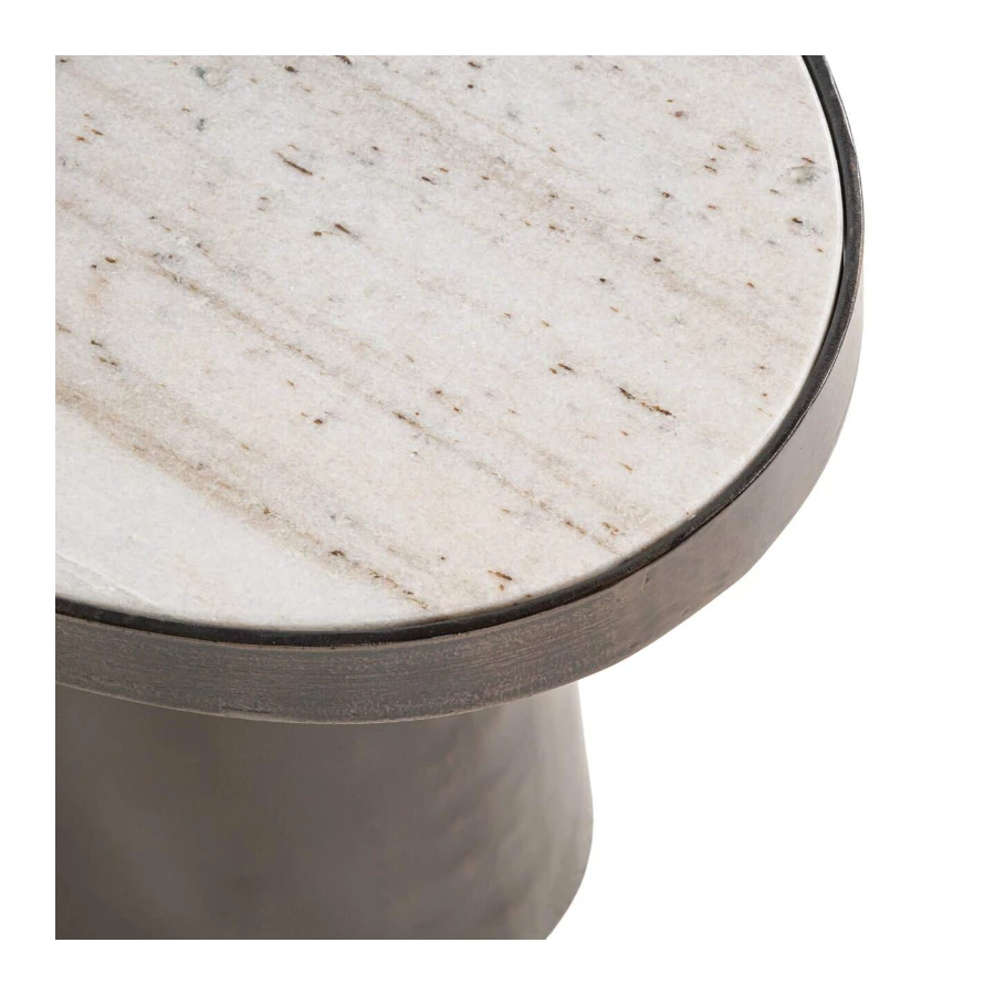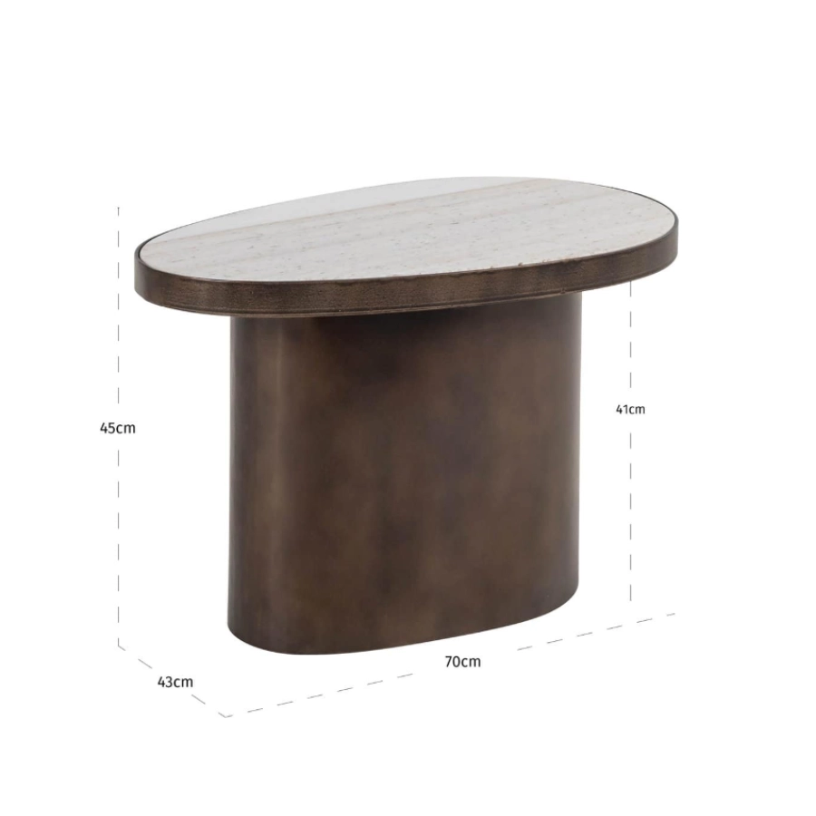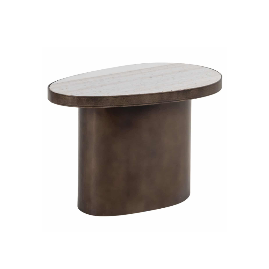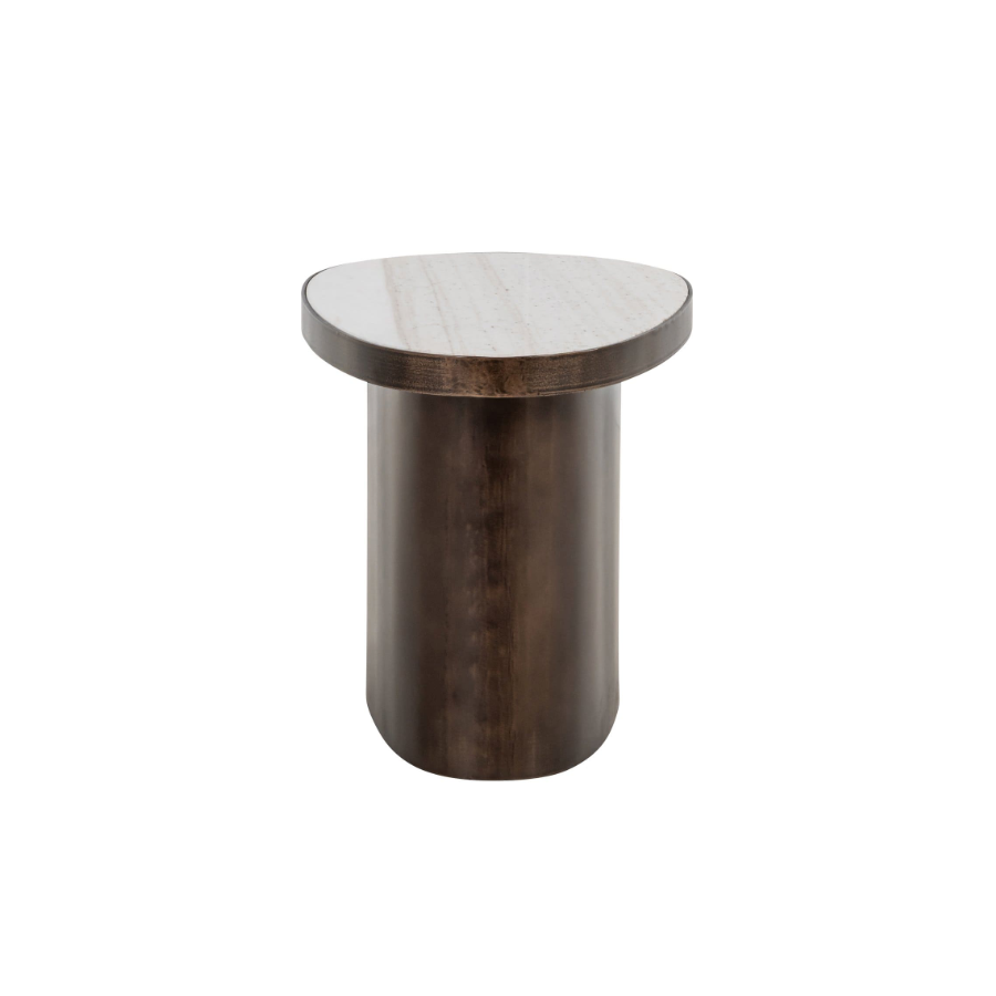 Its rounded Morchana marble top exudes natural elegance, beautifully offset by a bronze-brown finished metal base that adds warmth and depth. The smooth, curved silhouette brings a sense of softness while maintaining a contemporary edge, making it an ideal companion beside a sofa or lounge chair.