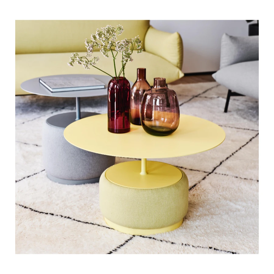 Minimalist Metal Top: The slender, floating-effect tabletop (available in painted metal) sits lightly atop the upholstered base, connected by a sleek central stem. Its ultra-thin profile and matte finish create a visually balanced contrast.