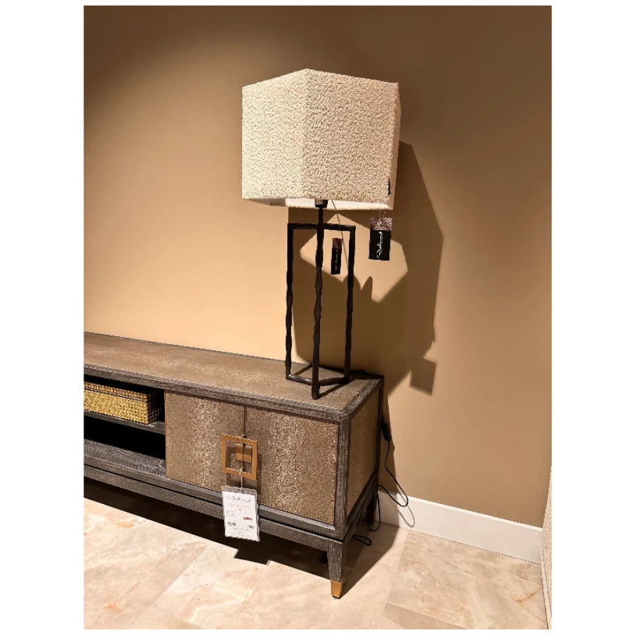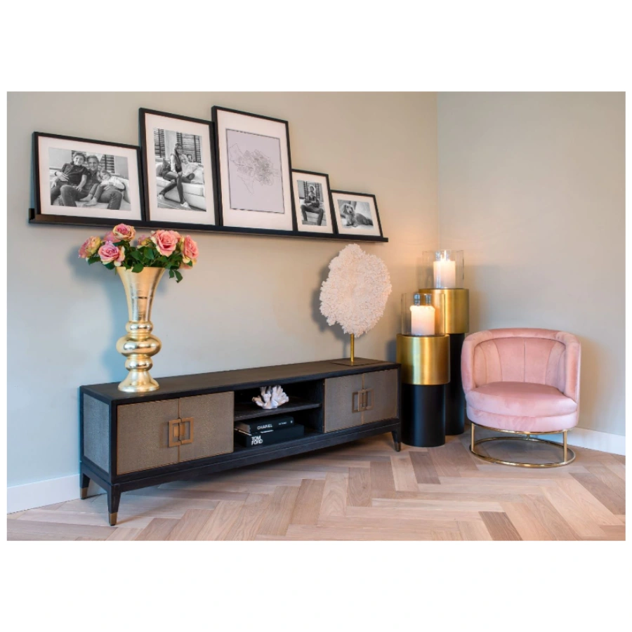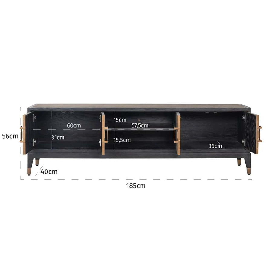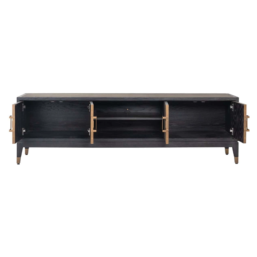 This art deco style TV cabinet is mounted and framed in black oak, creating a stunning contrast of matte and gold colours.