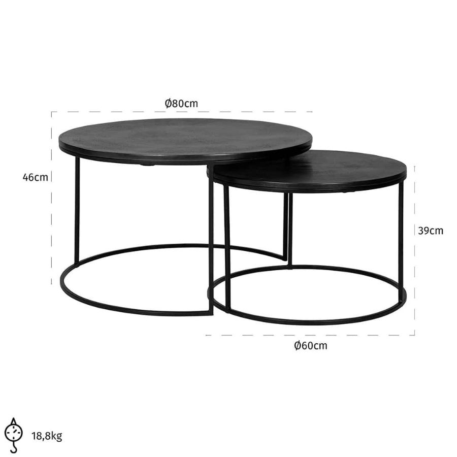 This duo features sleek iron frames that exude a modern charm, each supporting a round top crafted from sophisticated black aluminium. The beauty of this set lies in its versatility; these tables can be elegantly arranged together for a cohesive look or nested to save space, catering to both spacious and compact environments.