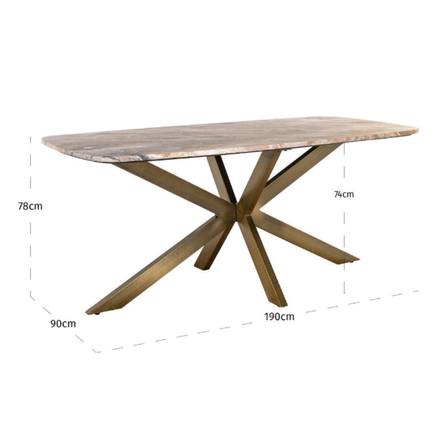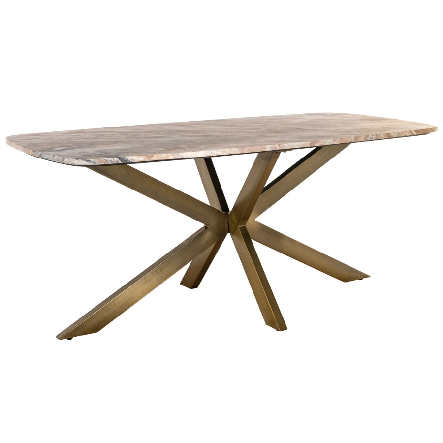 The Bottega dining table with a Danish oval top combines elegance and functionality, featuring a luxurious Toronto marble tabletop and a gold-colored spider base as a striking focal point.
