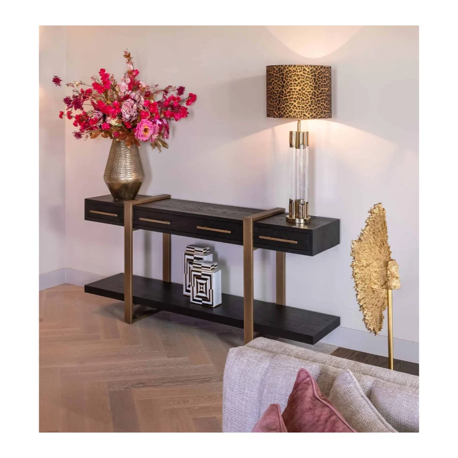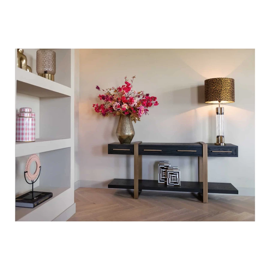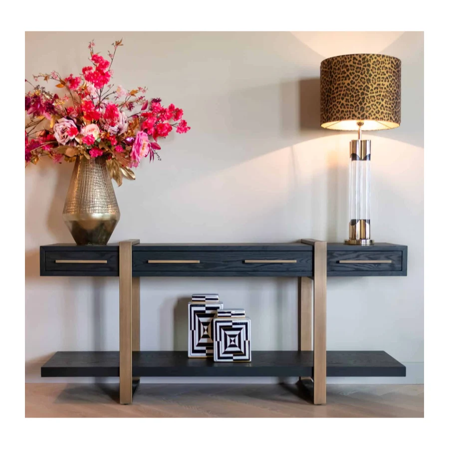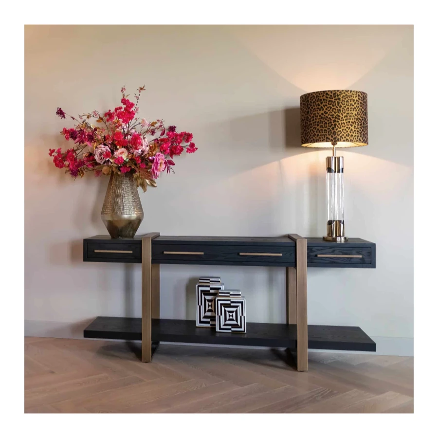 Its large shelf is ideal for displaying decorative items such as vases and sculptures.