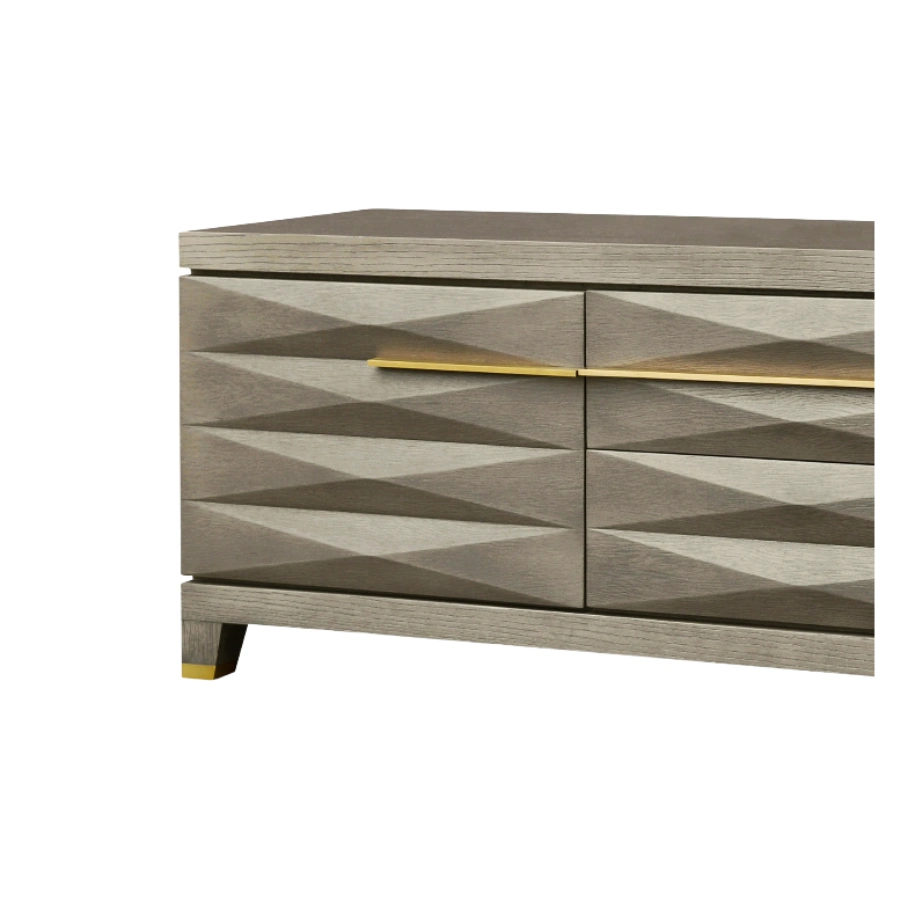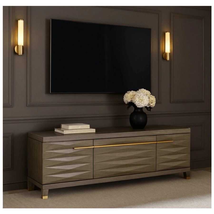 The Cassis Media Unit has 2-doors and 2-drawers and comes in a striking diamond shaped design, which is finished in textured grey/taupe coloured oak veneer, and is fitted with gold handles.