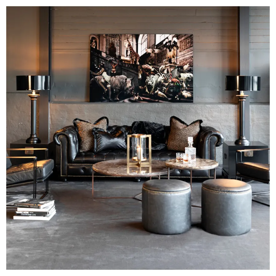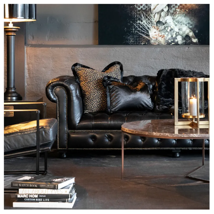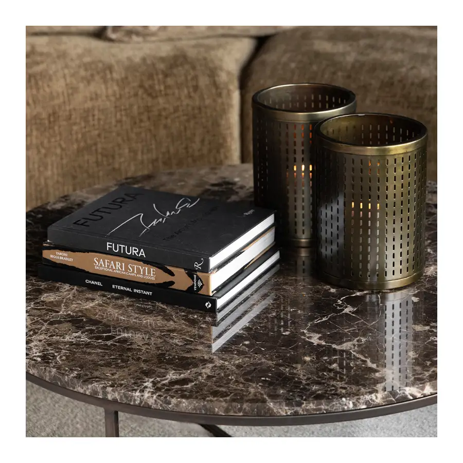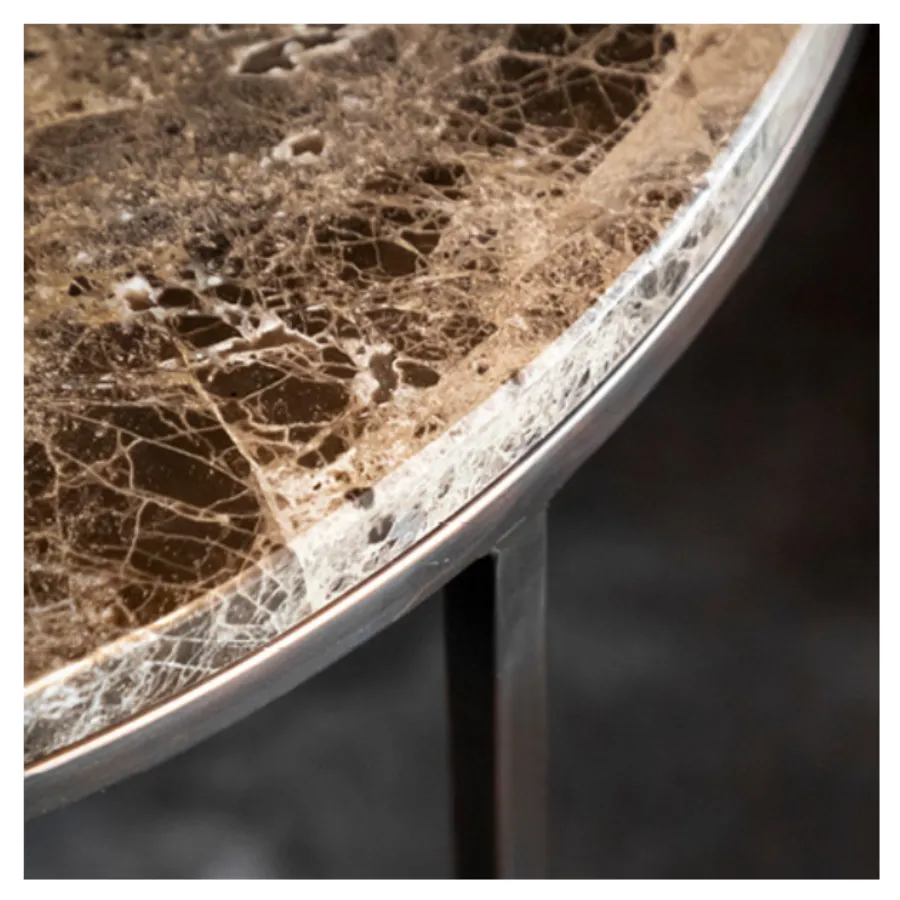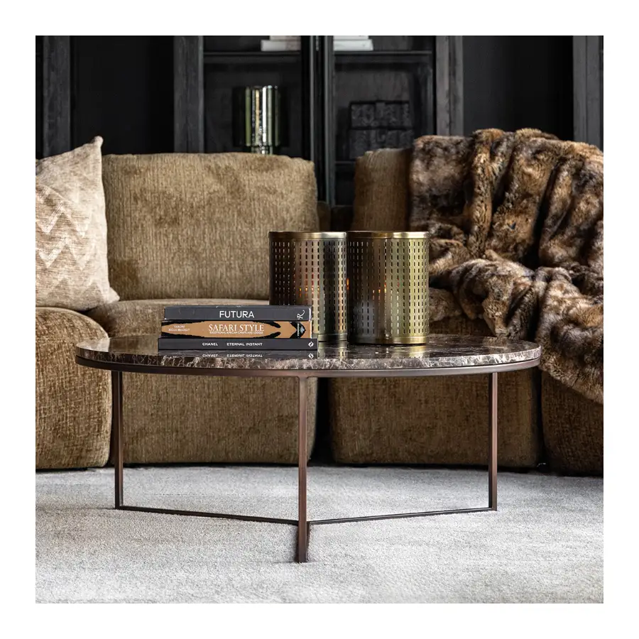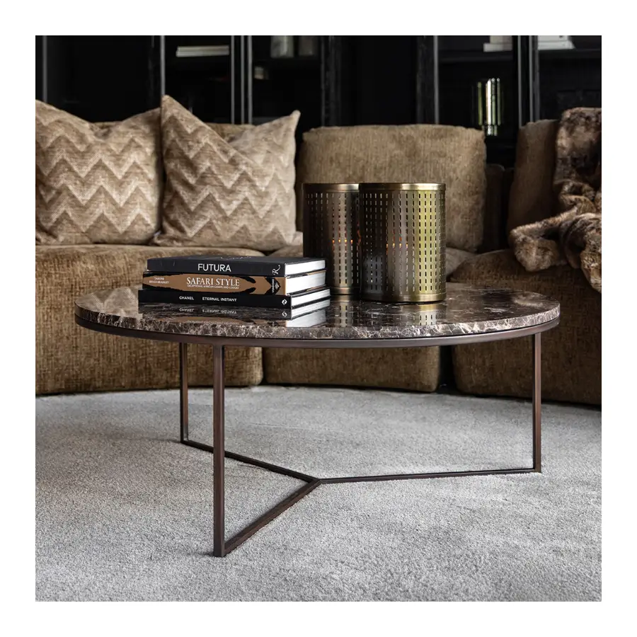 The tabletop, crafted from high-quality marble, offers a luxurious and natural feel with unique patterns that make each table truly one of a kind. The sturdy three-legged base in a warm bronze finish complements the elegance of the marble and adds a modern touch. The round shape and the exclusive combination of materials make this coffee table a perfect centerpiece for the living room.