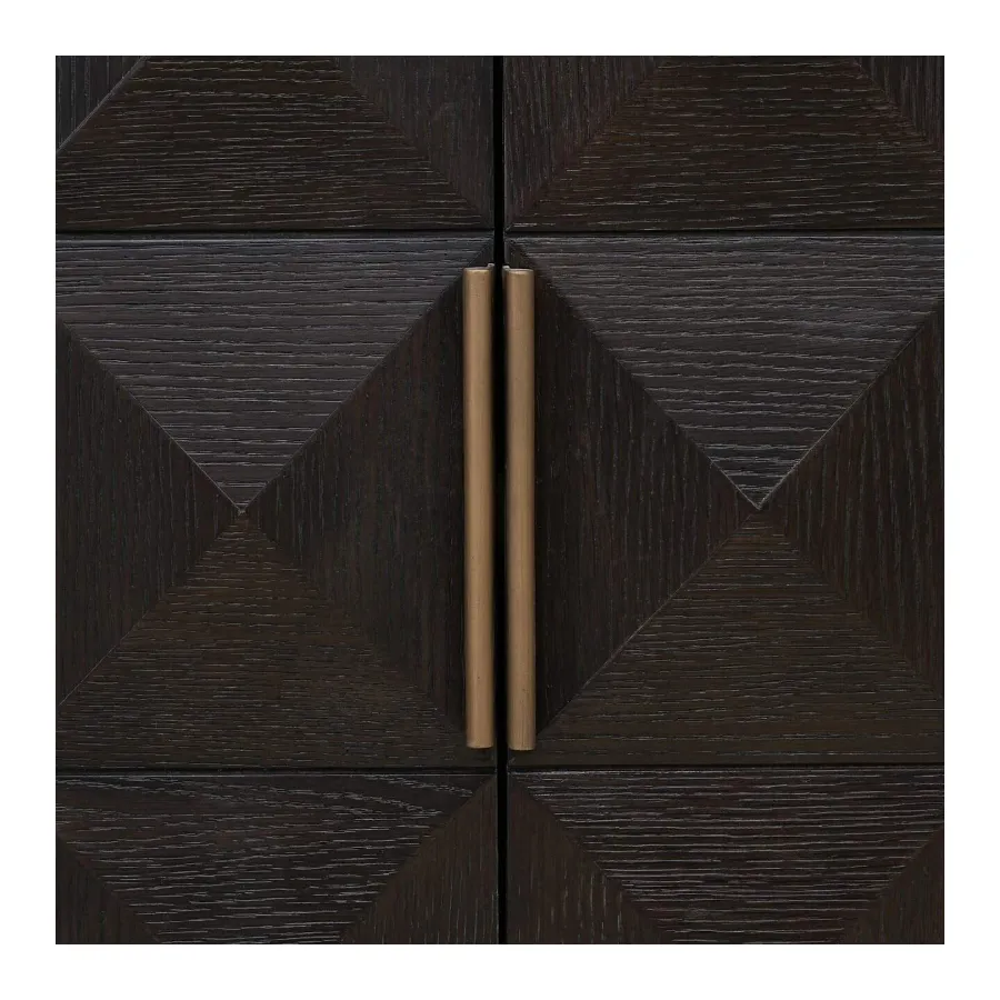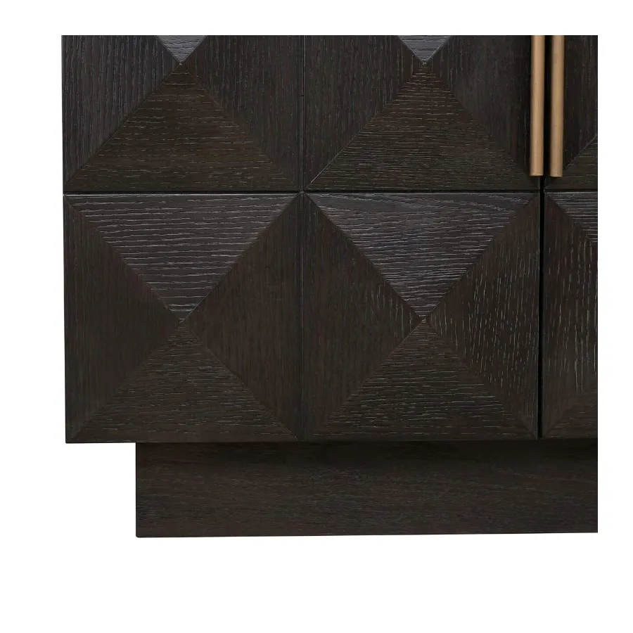 The sideboard features four doors with a striking geometric pattern, creating a modern and characterful look.