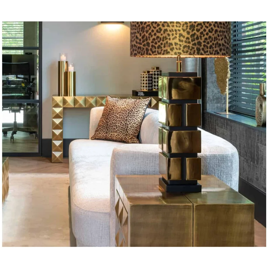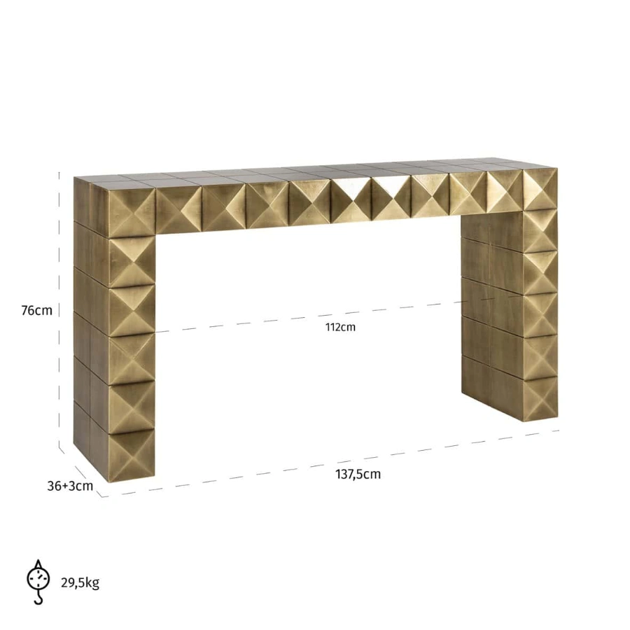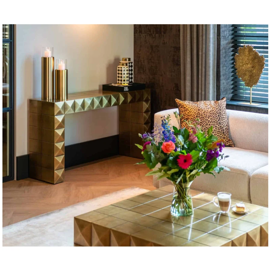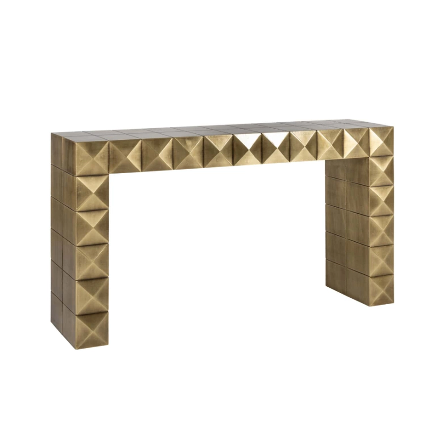 The Collada console table is a unique design by Richmond, featuring a gold-coloured finish and a striking pyramid motif.