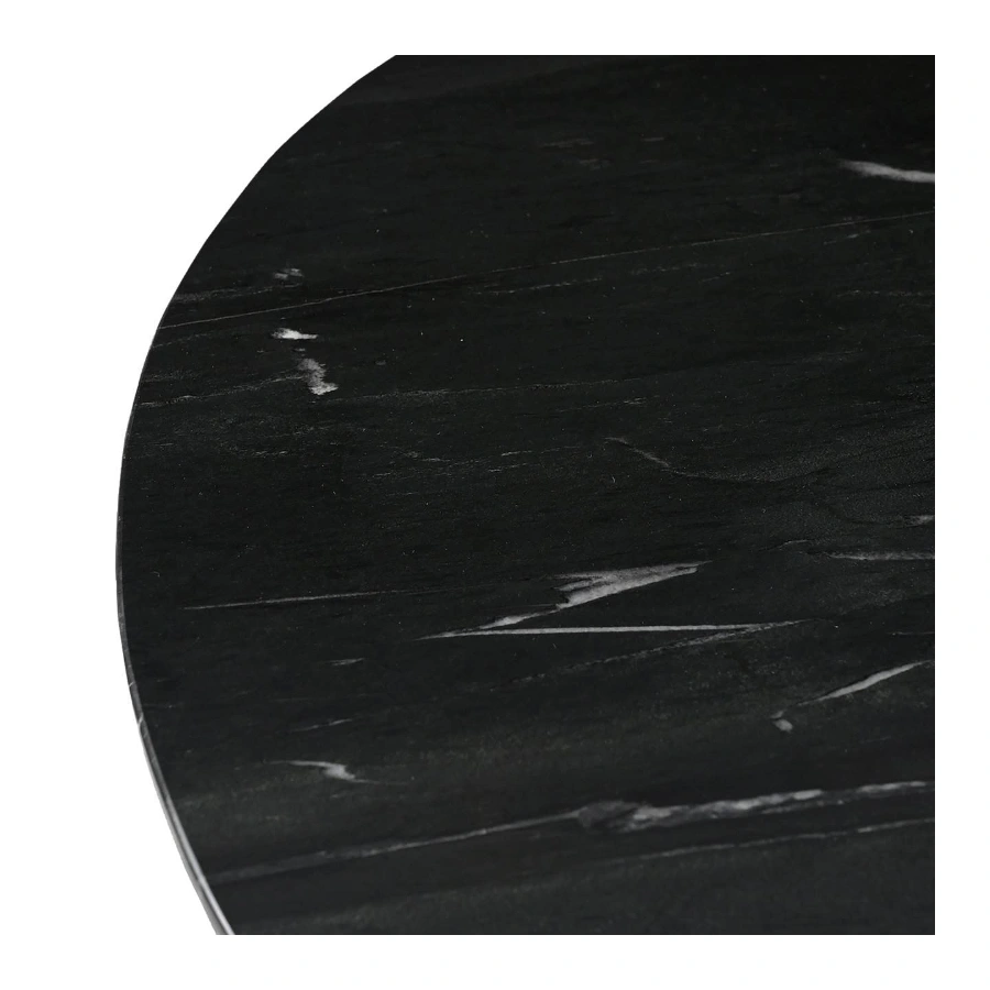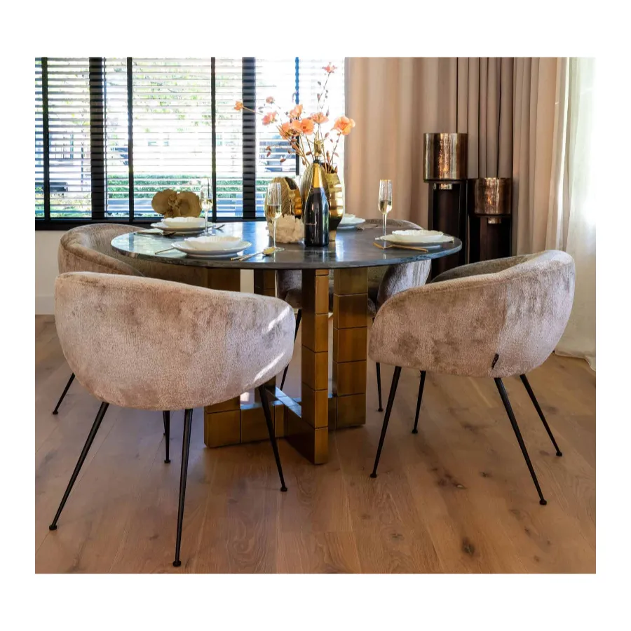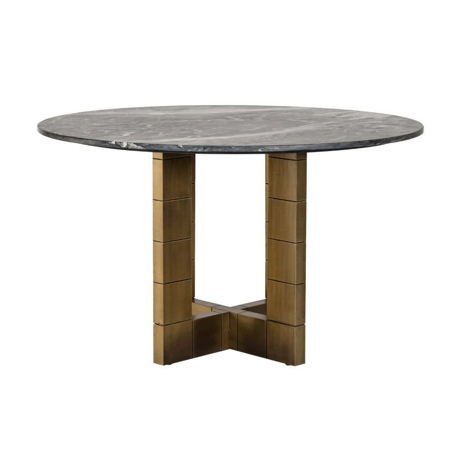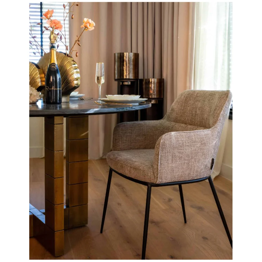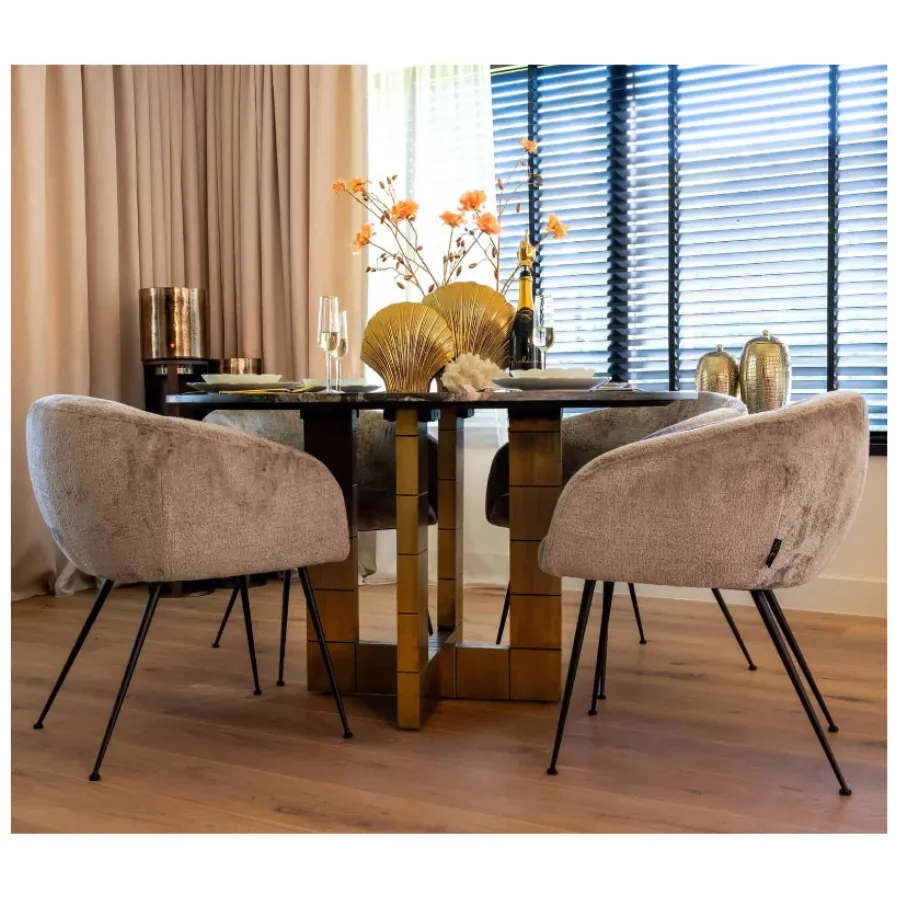 This table, with its crossed, angular base, is a masterpiece in adding grandeur to any dining area. Finished in brushed gold, it provides a dazzling contrast to the round top, crafted from exquisite black marble. This striking combination of the warm gold tones and the rich, dark marble creates a breathtaking visual impact, making the Collada Dining Table a focal point in your space.