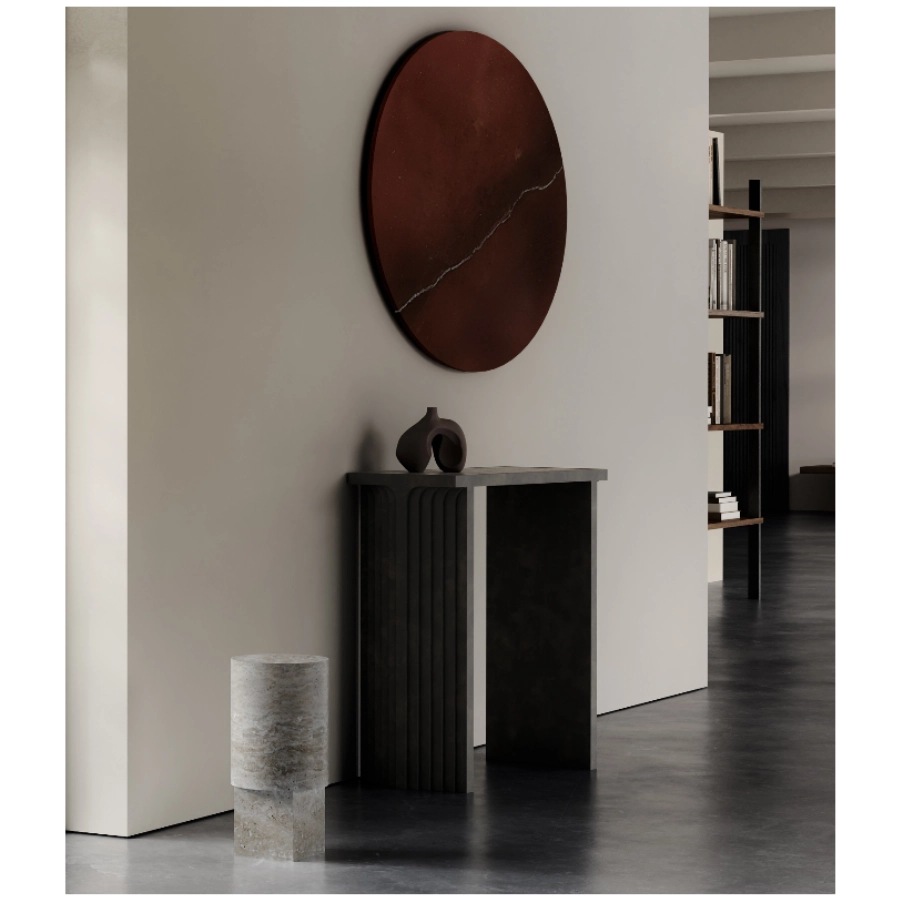 As travertine is porous, spills should be wiped away promptly to avoid staining, particularly from liquids such as wine, coffee, or oils. Avoid acidic or alkaline cleaners, vinegar, citrus, or abrasive pads, as these may etch or scratch the stone. For serving, use utensils with care and avoid cutting directly on the surface to preserve its finish.