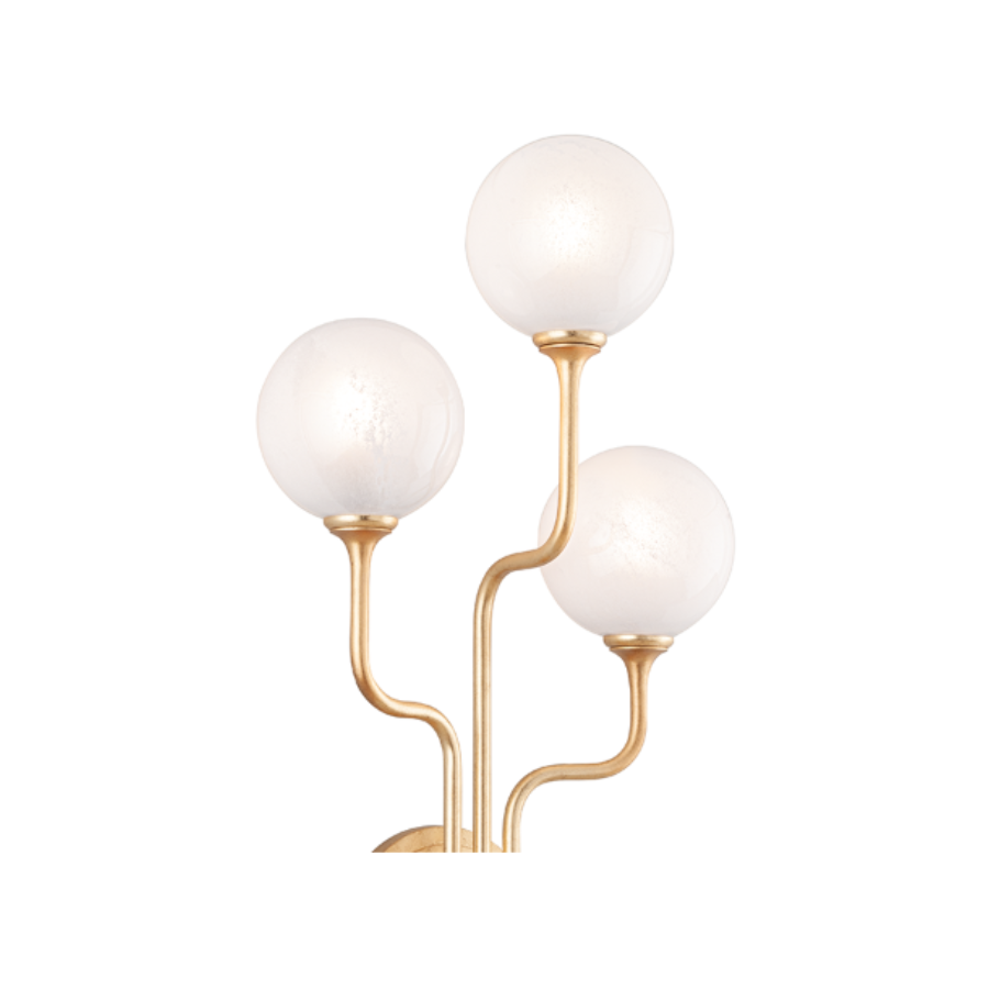 Featuring gracefully curved arms finished in vintage gold leaf, each arm supports a glowing glass globe that appears to float effortlessly. The etched interior of the glass enhances light diffusion, creating a warm and inviting ambiance, while the layered patina on the metal adds a refined vintage character.