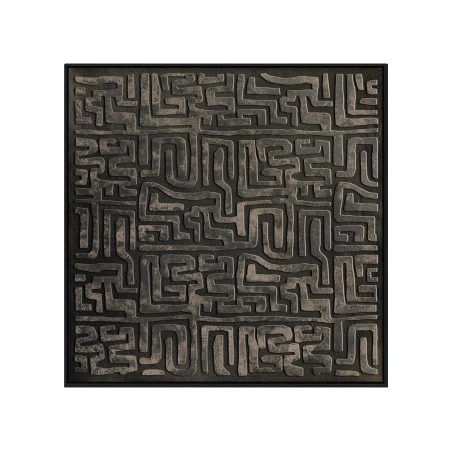The artwork depicts the contours of a back, creating a subtle and artistic impression. The painting is framed in recycled wood, adding a rustic and natural charm. On the back of the wooden frame, a metal logo highlights the meticulous design and high-quality craftsmanship.