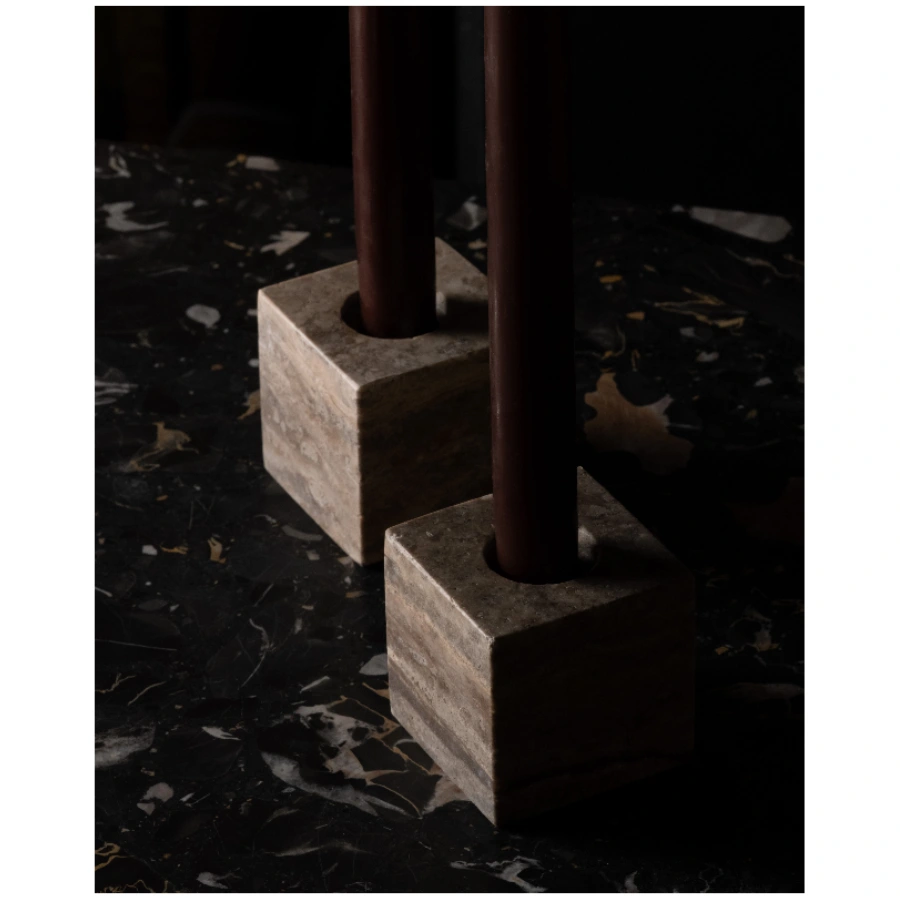Conceived as small architectural sculptures, the Cube Candle Holders interact with candlelight to create a gentle tension between rational form and poetic presence. The layered silver-grey, taupe, and soft earthy tones of Silver Travertine Earth bring depth, warmth, and timeless elegance to any interior, grounding your space with refined strength.