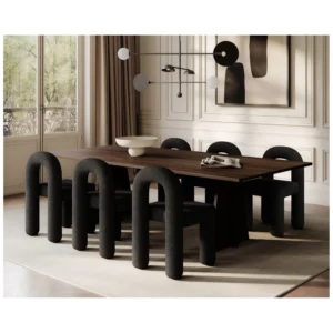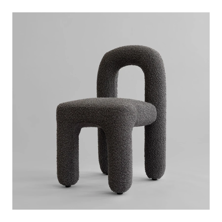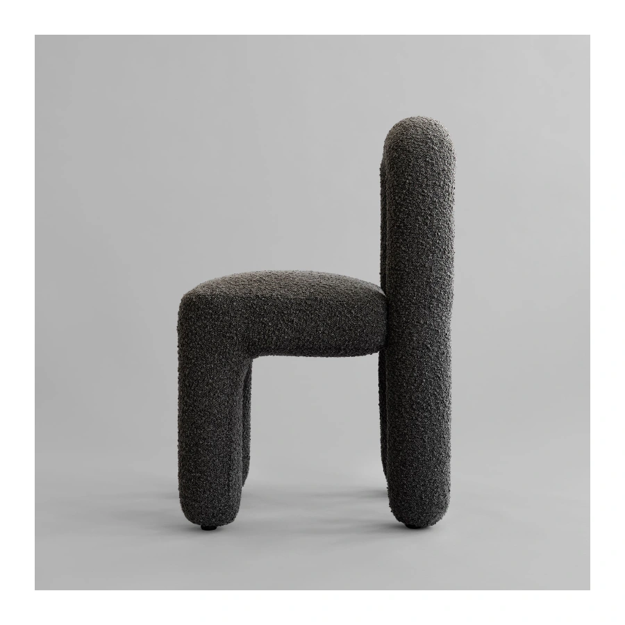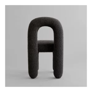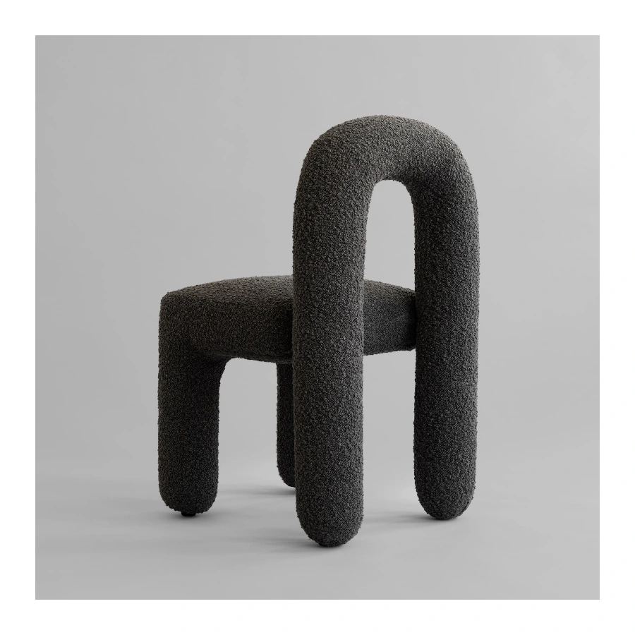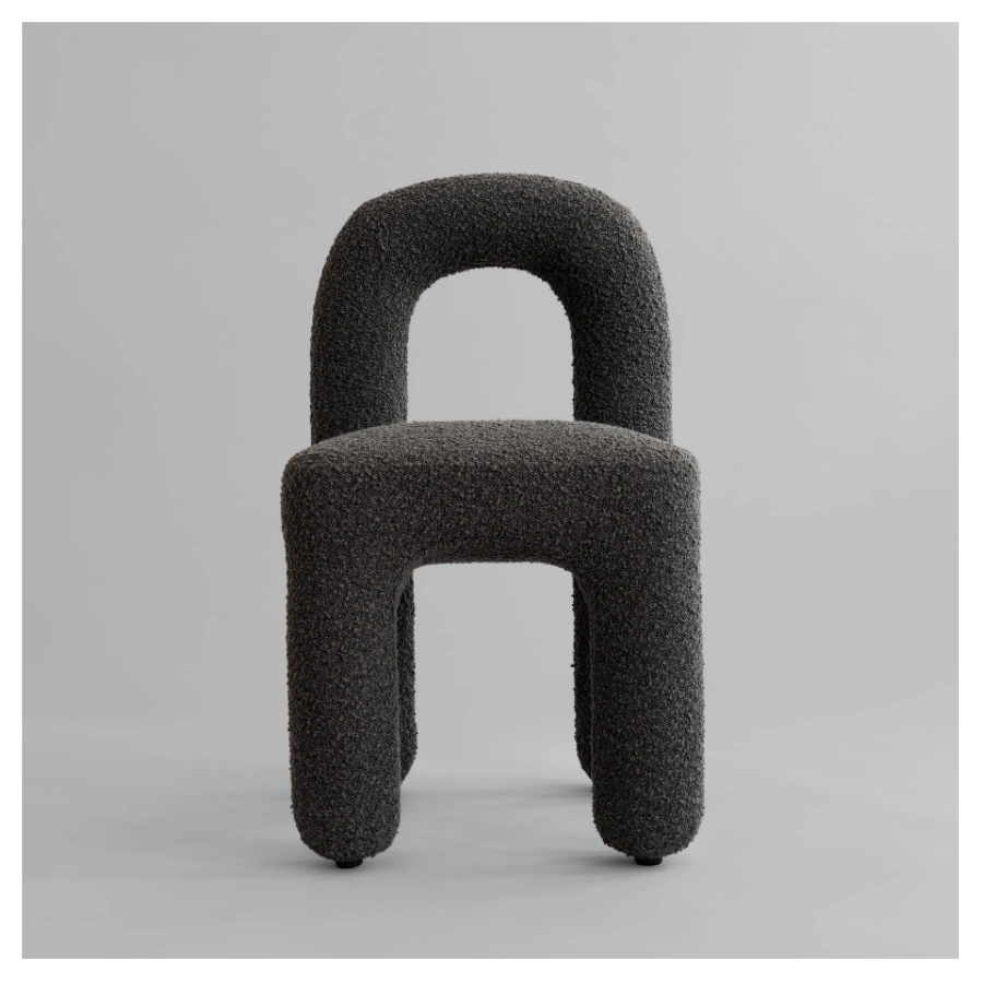The subtle division between seat and backrest creates an almost floating effect, adding lightness to the sculptural form. Its geometric clarity brings a refined architectural presence to the dining table, while the open, inviting shape encourages comfort and social connection during meals.