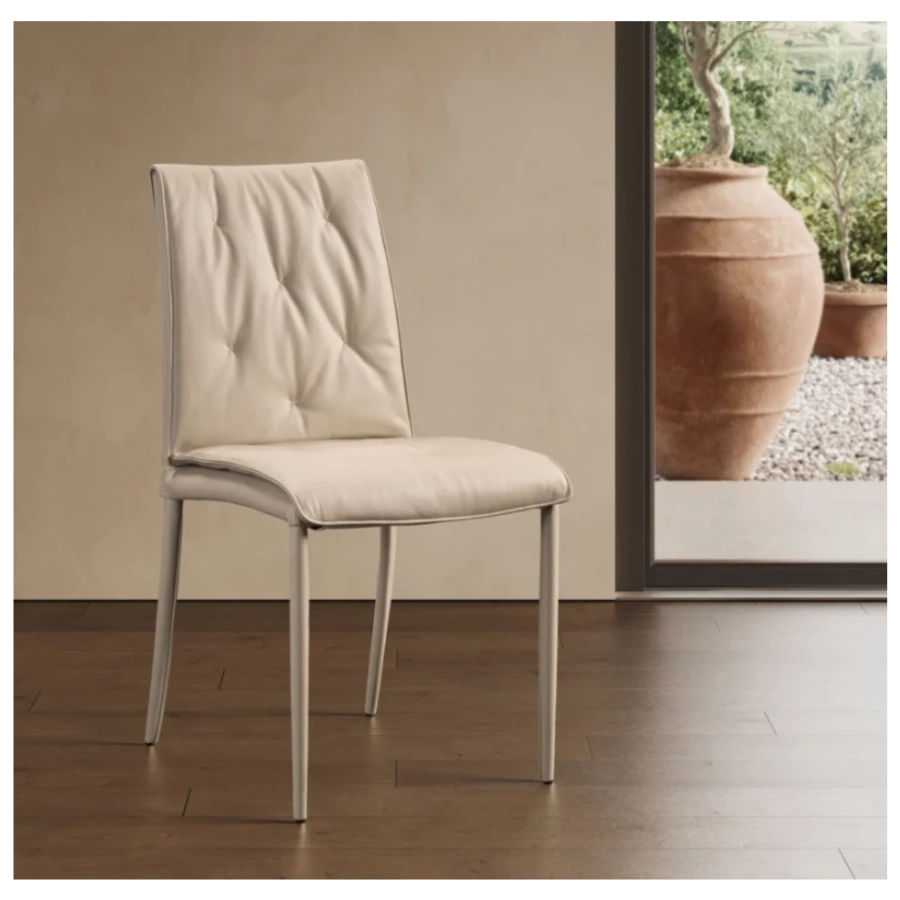 Diva M’s softly contoured high backrest and generously padded seat offer comfort with a contemporary silhouette. The premium cream leather upholstery is accentuated by gentle tufting and stitching details, highlighting the expert Italian craftsmanship. The steel frame, discreetly clad in matching leather, creates a unified aesthetic while providing excellent structural support and subtle grace. With slender profile and ergonomic form, this chair is ideal for both residential dining rooms and refined hospitality environments.