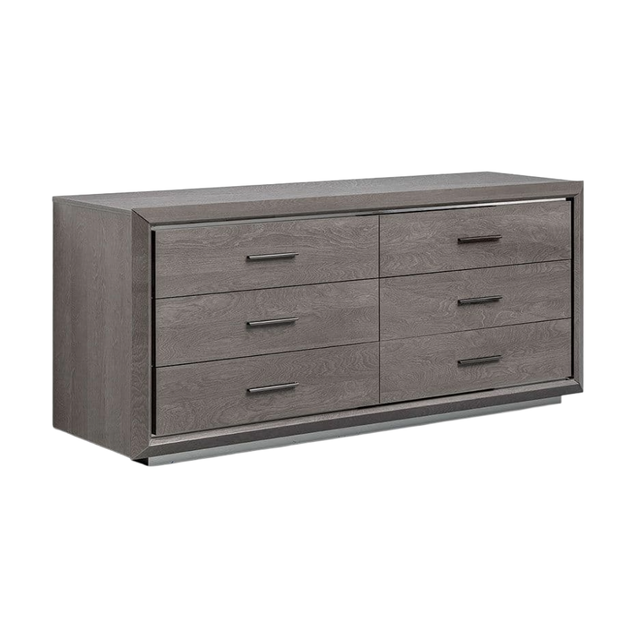 This Elite bedside table is expertly crafted from gloss brown silver birch wood, which showcases a finely textured woodgrain beneath a lustrous, reflective surface for an opulent, contemporary look. The beveled frame, slightly angled with crisp lines, adds sculptural dimension and a sense of depth. It features two spacious drawers, each accented by slim, horizontal nickel metal handles that underscore its sleek profile. A matching nickel metal plinth base grounds the design, creating a slight floating effect while maintaining visual stability and harmony with other Elite collection pieces. The result is a bedside table that elegantly complements both classic and modern bedrooms, delivering style and smart storage in equal measure.