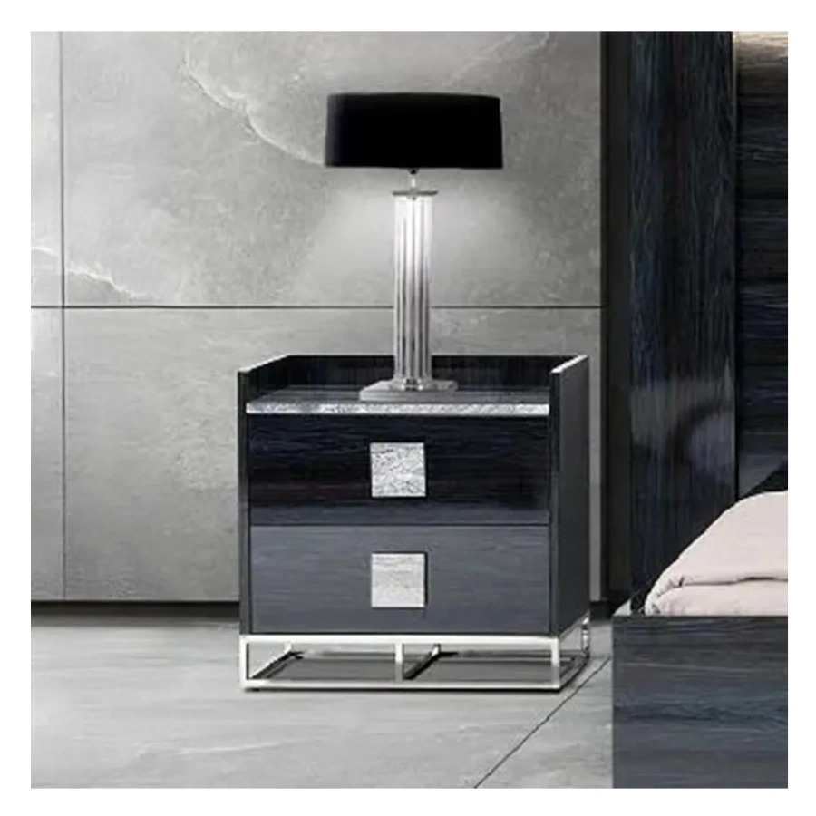 This bedside table features a rich matt black oak wood body, delivering a sleek and sophisticated appearance. The tactile, midnight grey marble top brings luxurious refinement, with each piece’s natural veining ensuring a unique pattern. Drawers are fitted with square marble handles, mirroring the top and adding to the tactile, layered look. The table’s silhouette is grounded by a polished stainless steel base, which brightens the overall design with a reflective gleam and enhances the feeling of airy elegance.