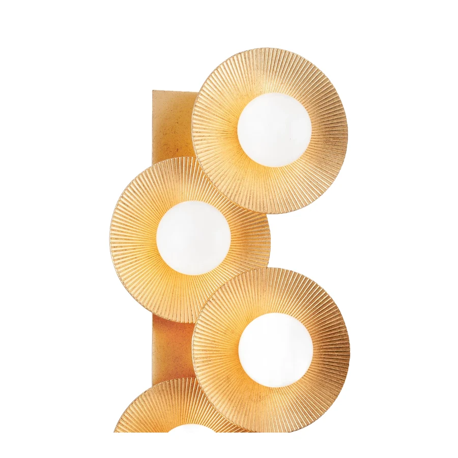 Its radial design boasts an exquisite vintage gold leaf finish, punctuated by ridged lines that catch and reflect light for a mesmerising effect. At the heart of each fitting sits a glossy opal glass shade, casting a warm, inviting glow across your space. Five such lights are elegantly aligned on a single gold leaf backplate, multiplying the visual drama.