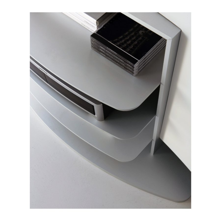 This stylish curved TV unit can take up to a 40 inch TV. It has built in cable routes in the back, and an aluminium CD/DVD rack on both sides which provides useful storage. The shelves are in painted aluminium for a DVD recorder, Sky box etc. The TV unit requires no mounting to the wall.