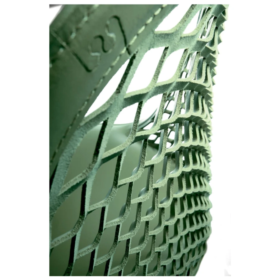 The body is entirely in leather, characterized by a mesh motif at the backrest.