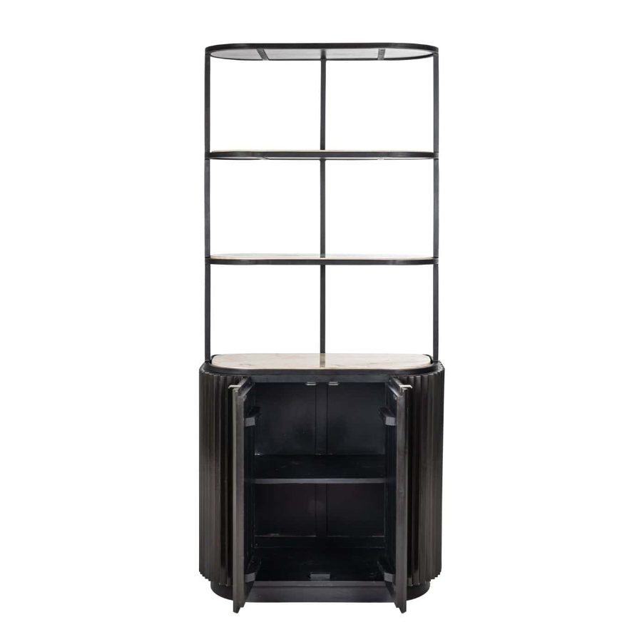 It has a sleek and modern design with two shelves and offers ample storage space for your crockery, glasses, and other personal items.