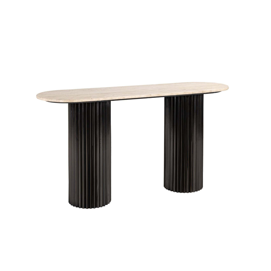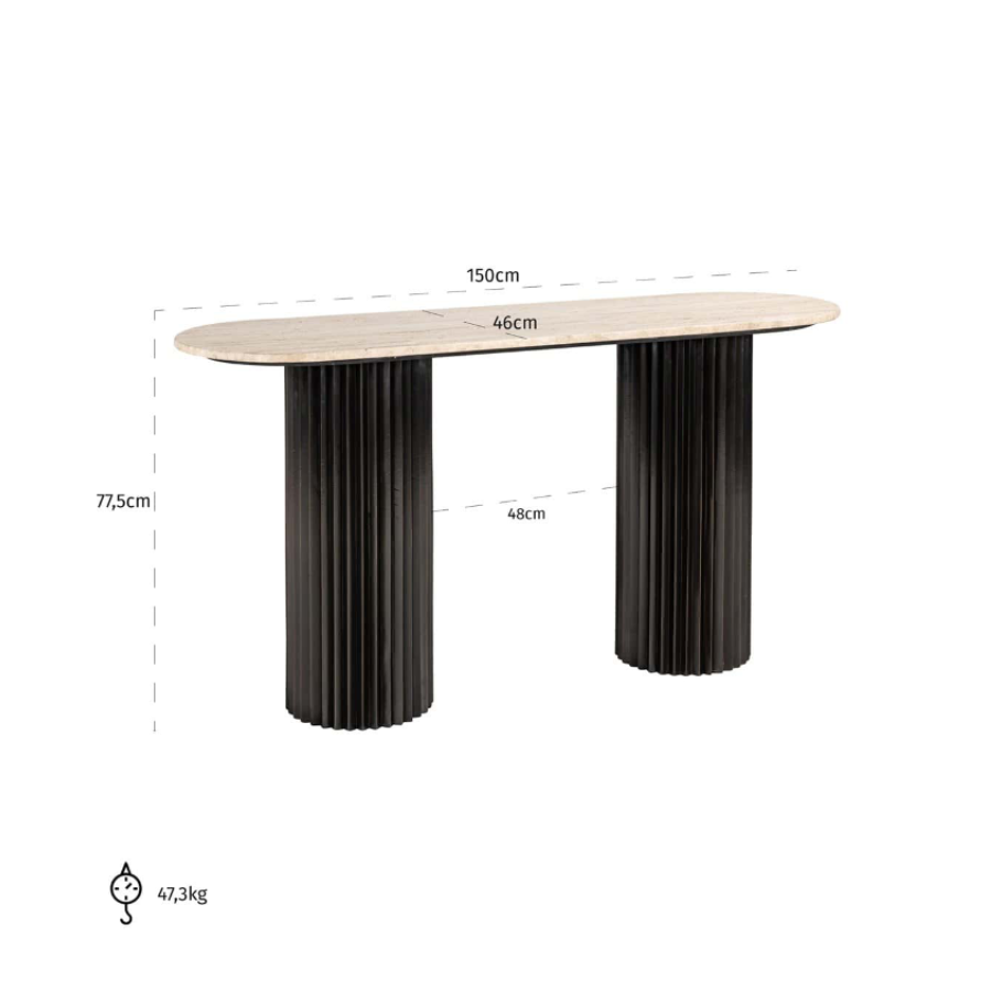 The table has a beautiful travertine tabletop and is supported by black metal legs.