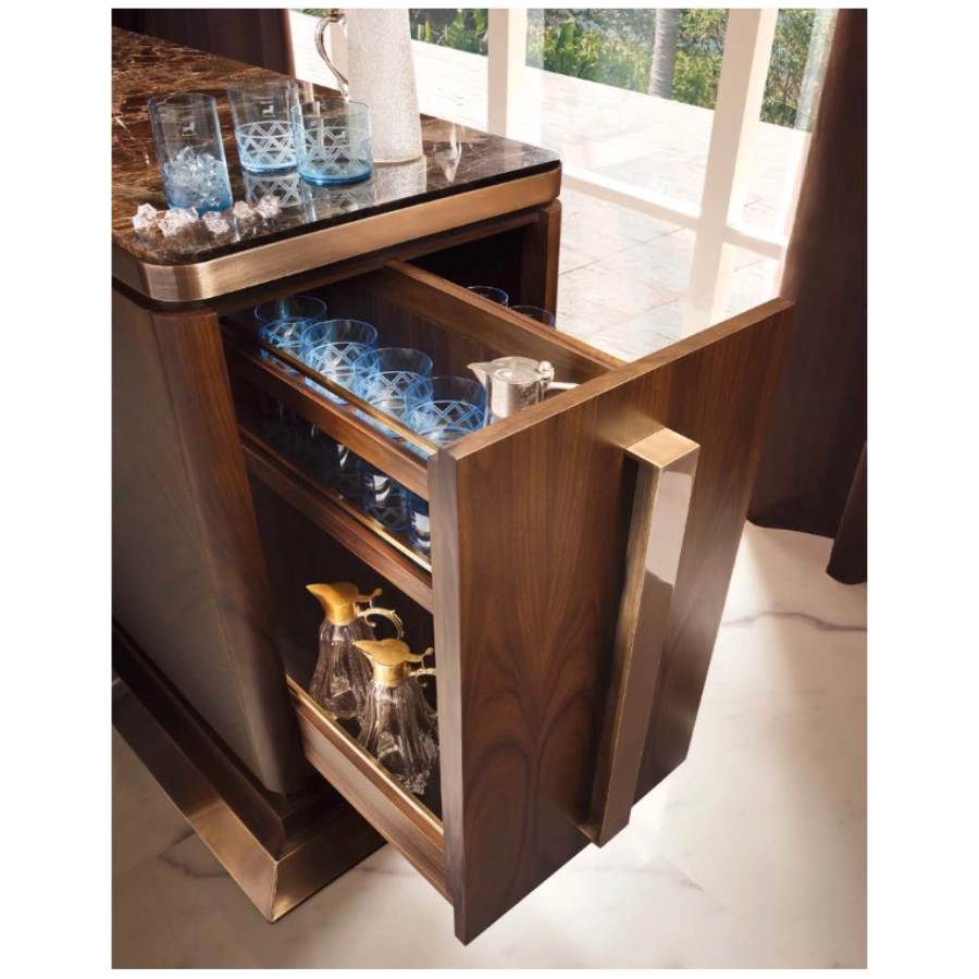 Wood bar cabinet with a Marquinia black marble shelf, 1 sliding glass holder shelf, 1 complanar door, 1 drawer, 1 cabinet with a shelf, 1 shelf, 1 fridge and brushed bronze details.