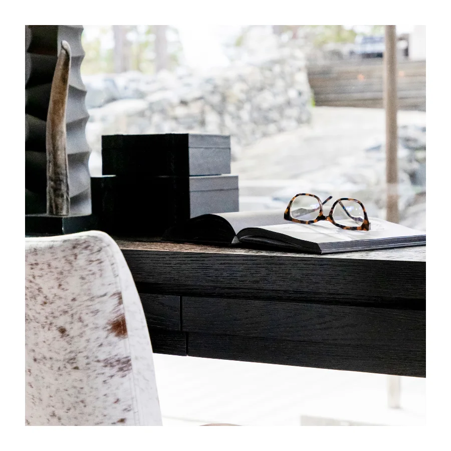 Hunter is a sleek desk in oak veneer with a straight and timeless design that fits seamlessly into any workspace.