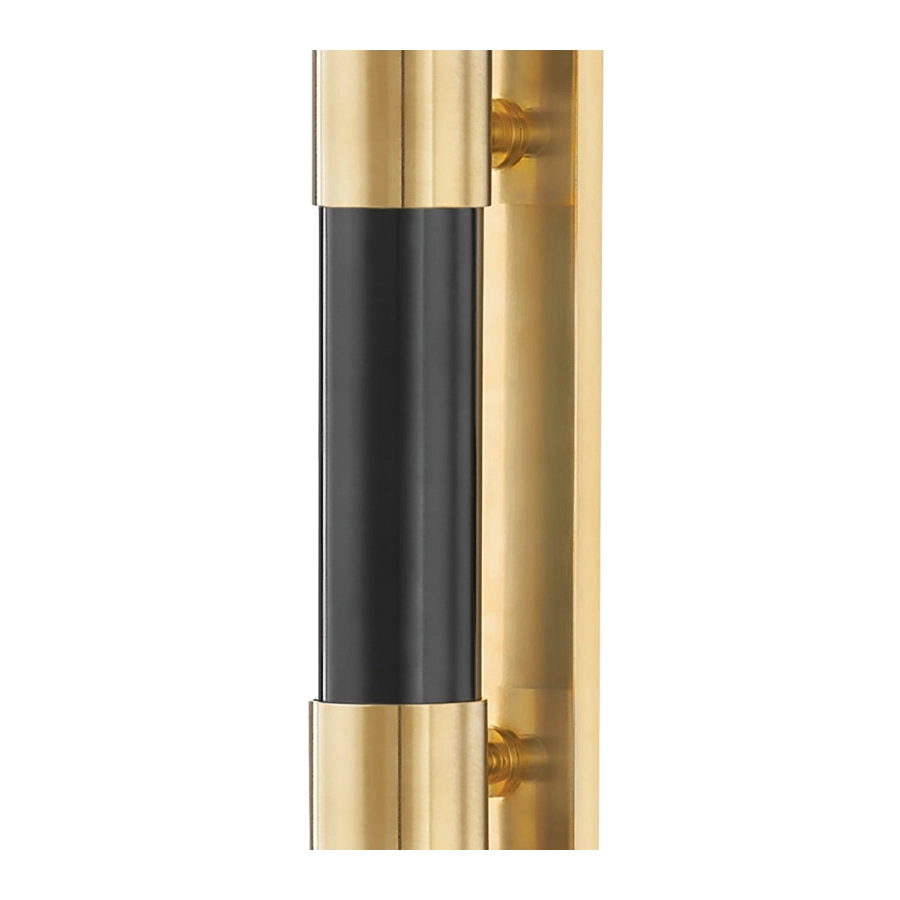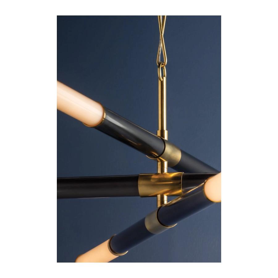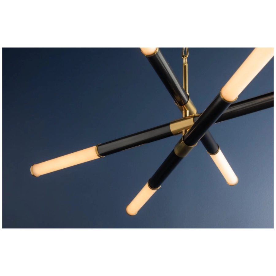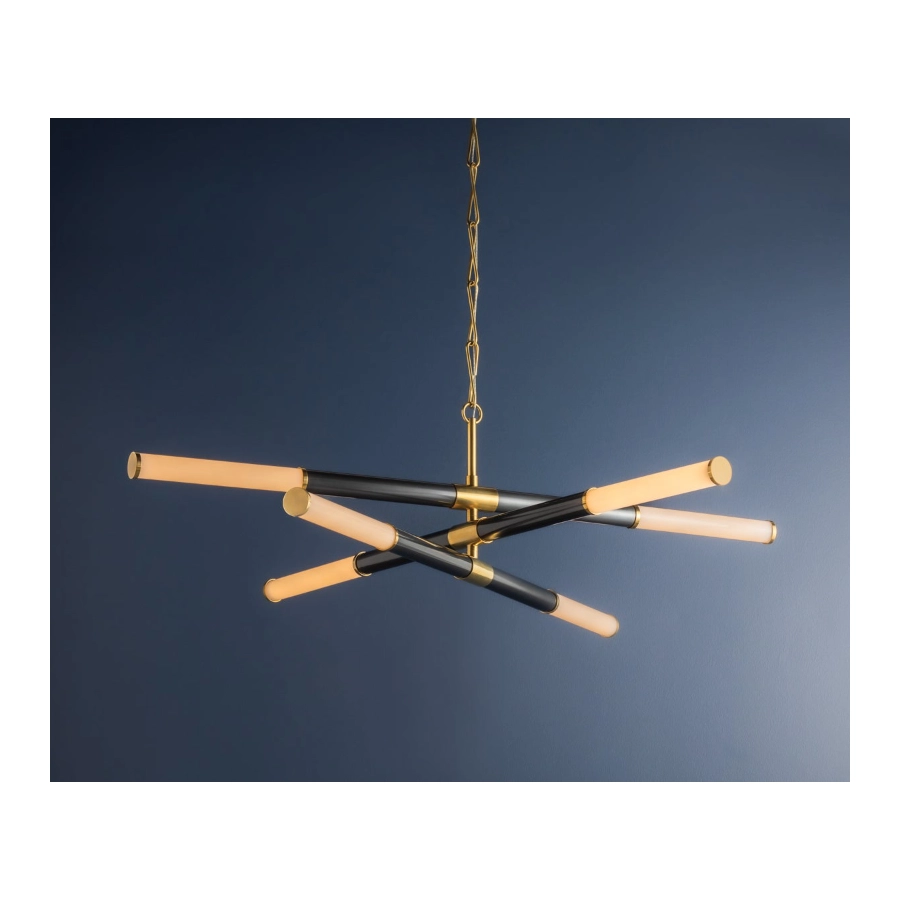 Milk glass tubes capped in metal sprout from each end of a similarly capped soft black shade creating a luxe layered look.