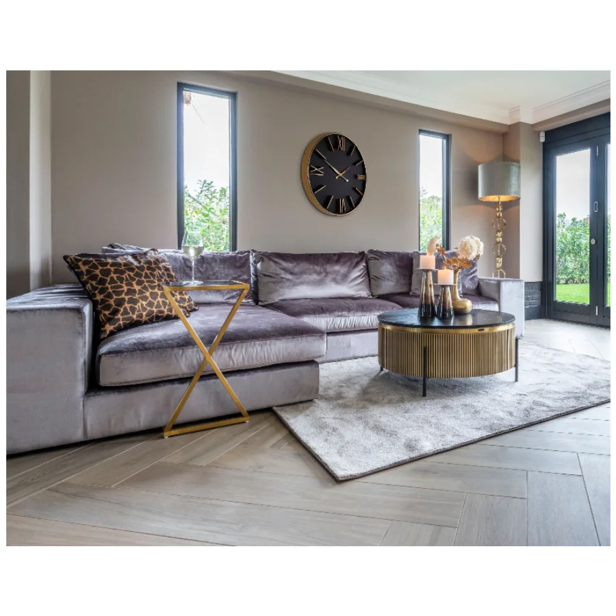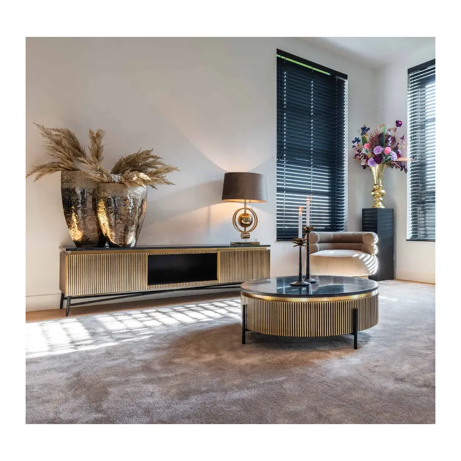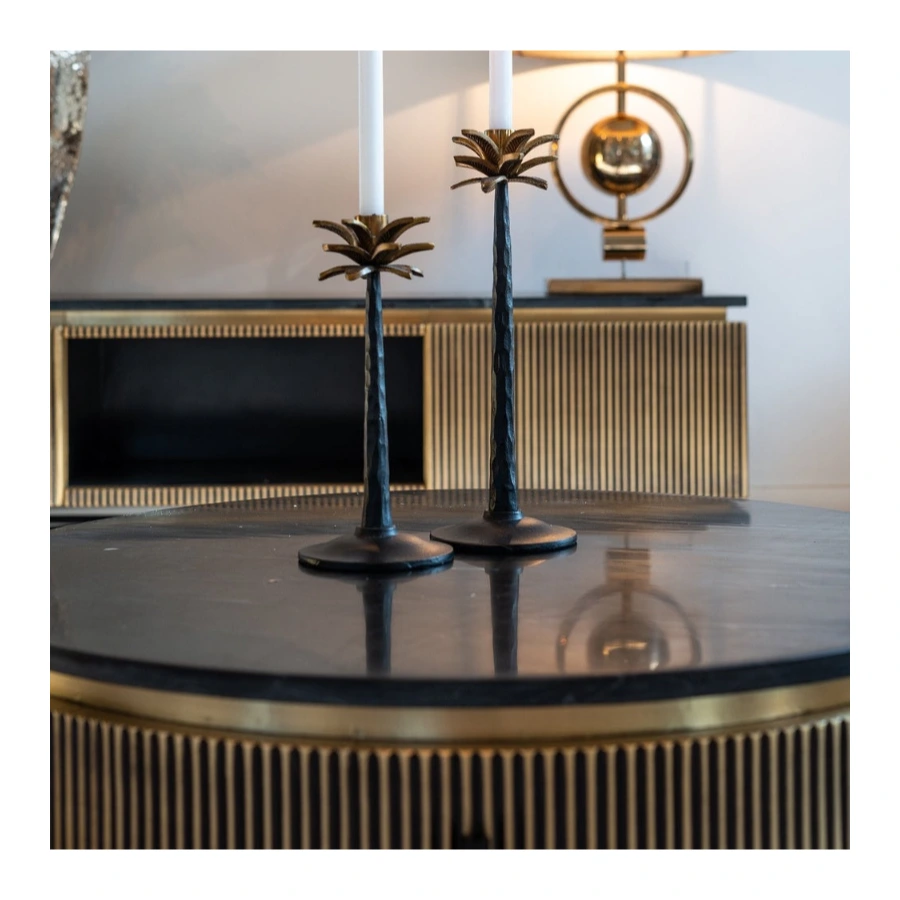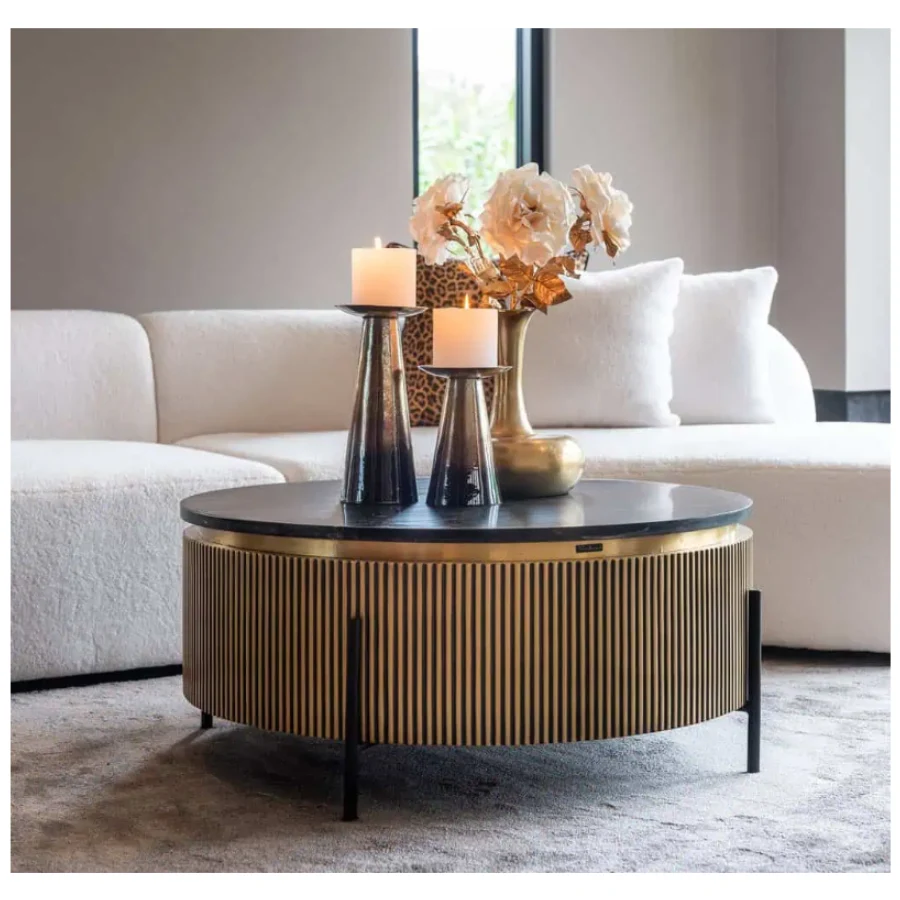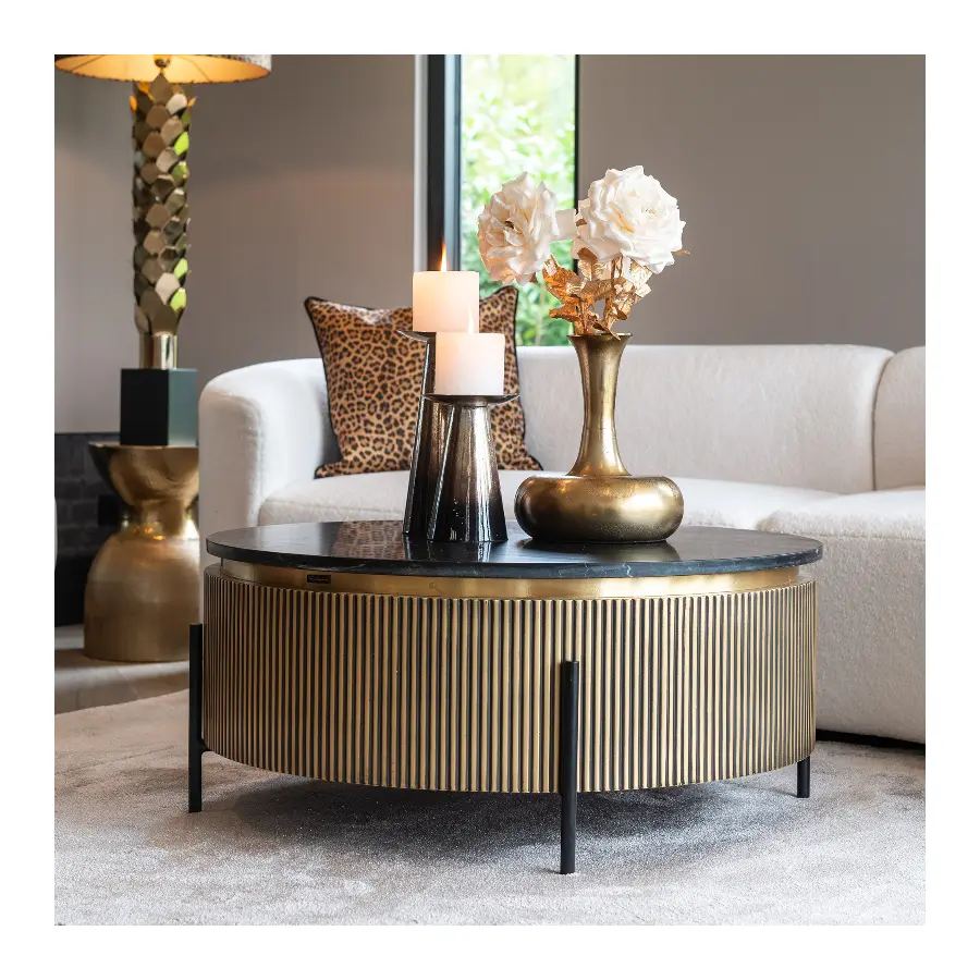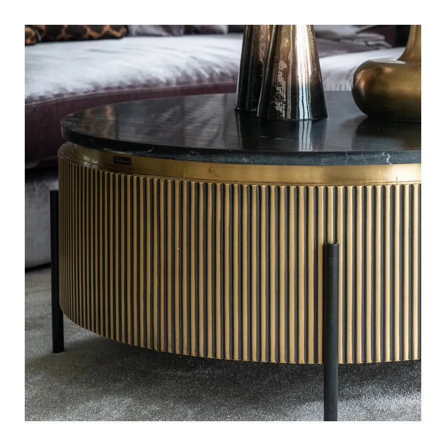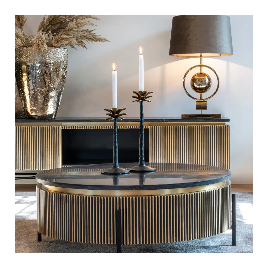 The antique brass-colored ribbed motif, is complimented by a real black marble top. This combined with the industrial iron base just add to its luxurious look.
