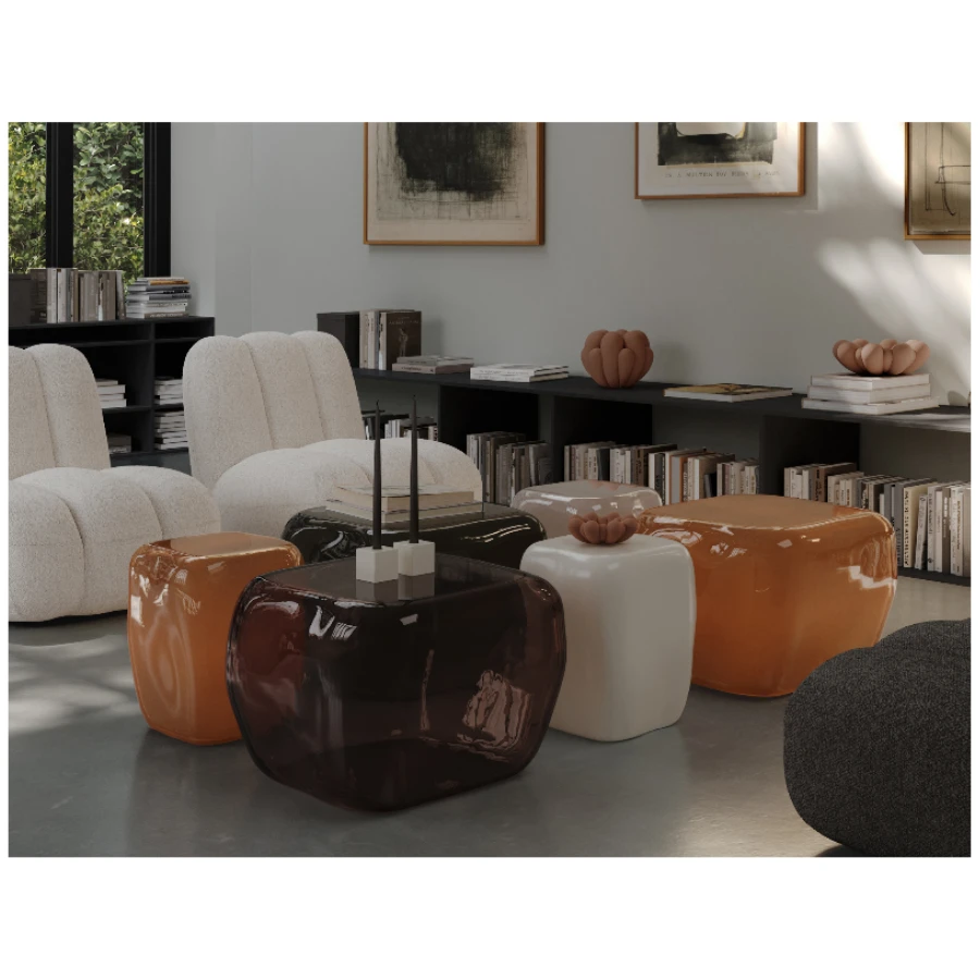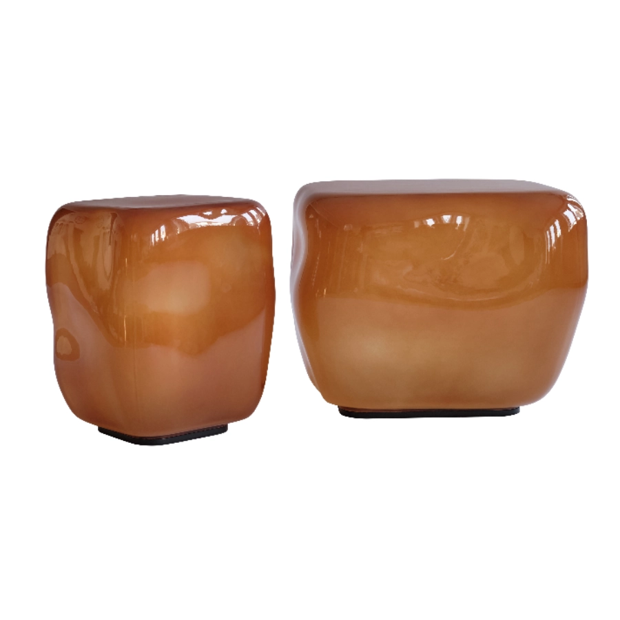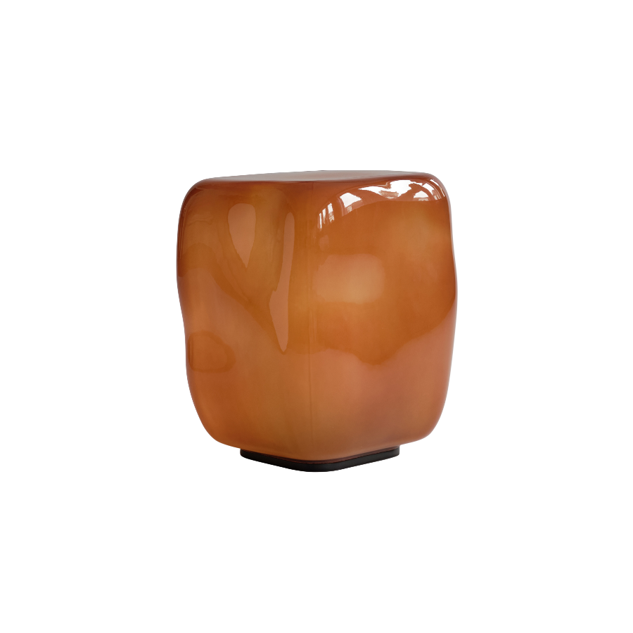 Crafted in painted glass, the surface is finished in a rich Caramel tone, a golden brown infused with soft amber warmth. The colour recalls golden resin and polished amber, catching and reflecting light with luminous depth. Pigment is applied to the inner surface of the glass, preserving the smooth clarity of the exterior while creating a layered, glowing effect. Subtle variations in the finish enhance its artisanal character, ensuring each table is uniquely alive.