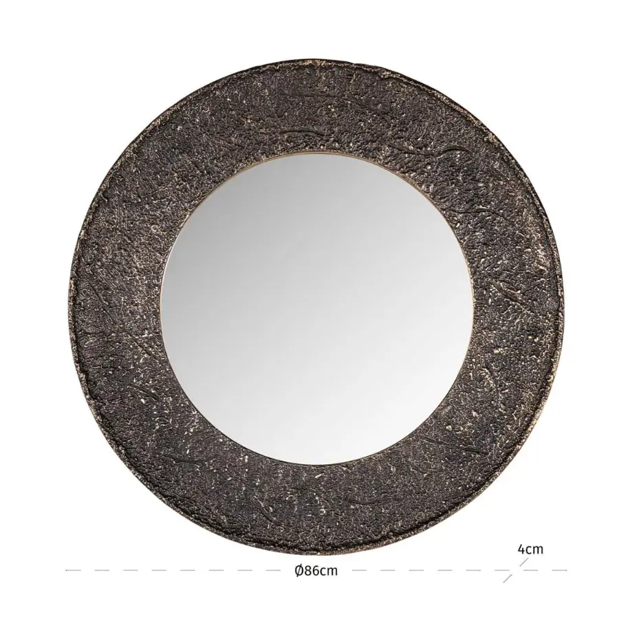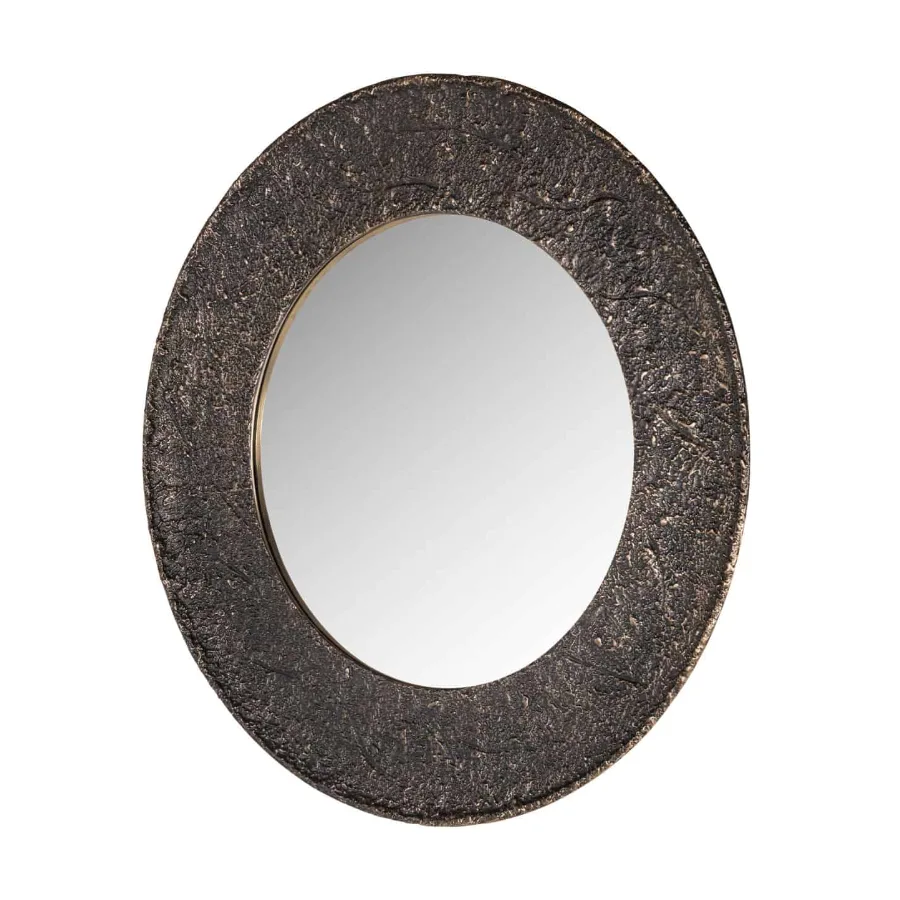 This mirror features a rounded shape with a slim frame in a bronze tone.