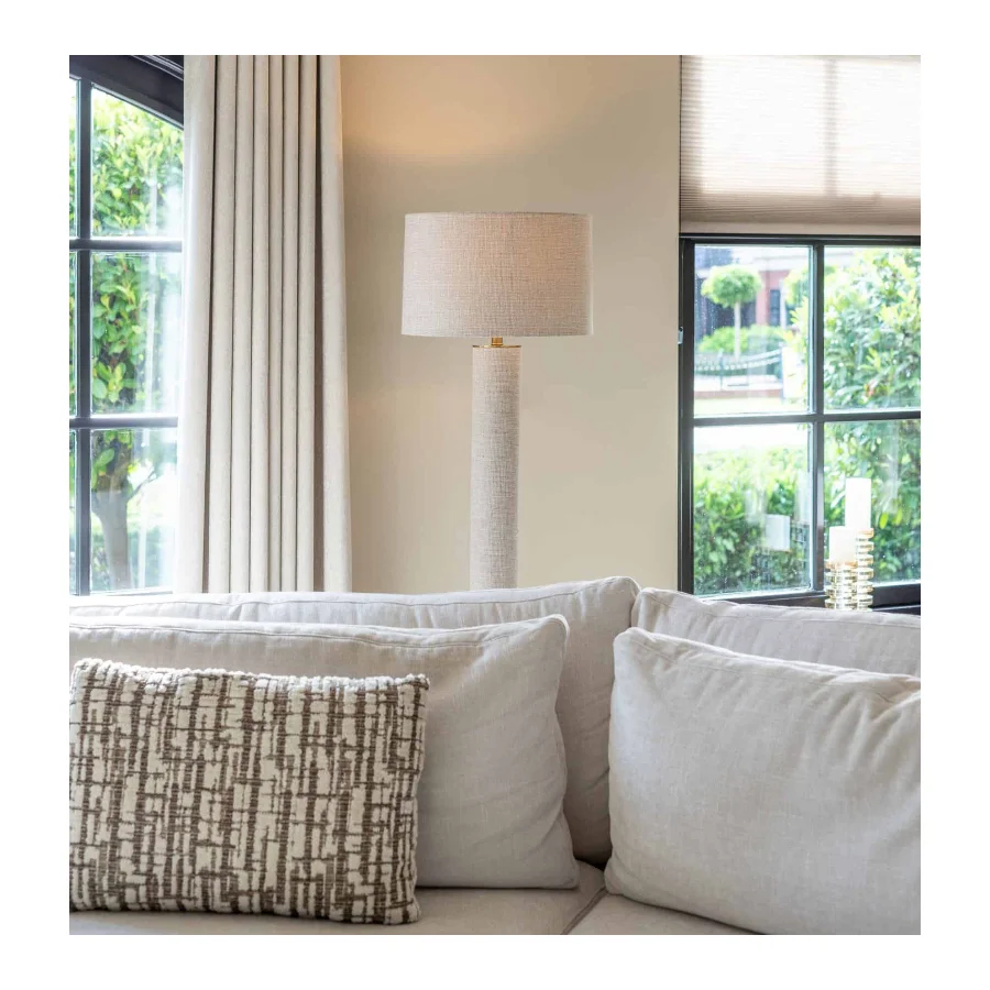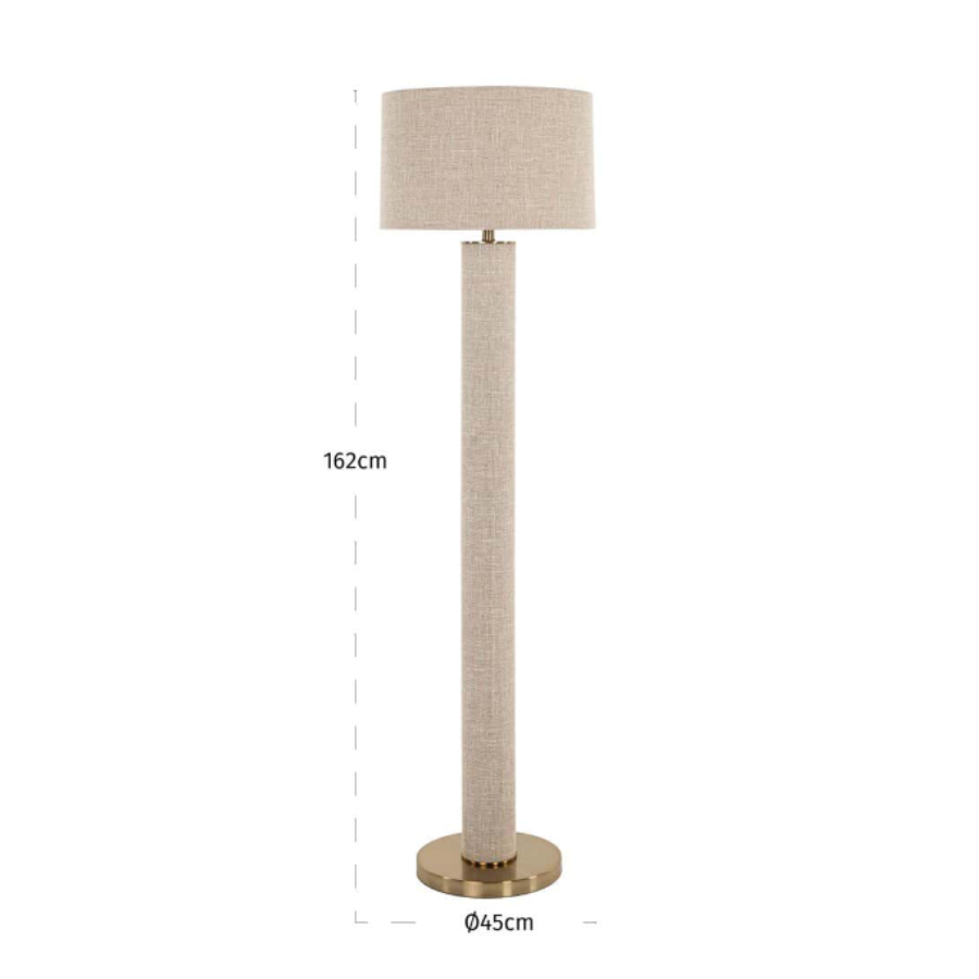 Featuring a gold metal base for a touch of sophistication, its slender frame is wrapped in textured beige fabric, mirrored in the matching shade for a warm, cohesive look. This design brings a soft, Scandinavian inspired aesthetic that suits cosy corners and minimalist interiors alike.
