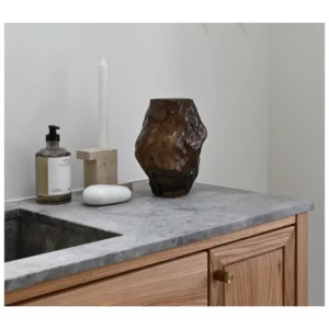 Glass: The material is heated to 1500 degrees before being shaped inside a custom mould. Air is then blown into the glass to achieve the desired shape and afterwards taken out of the mould to place inside an oven for tempering. Depending on the product the inner surface is spray painted to achieve the signature colour.