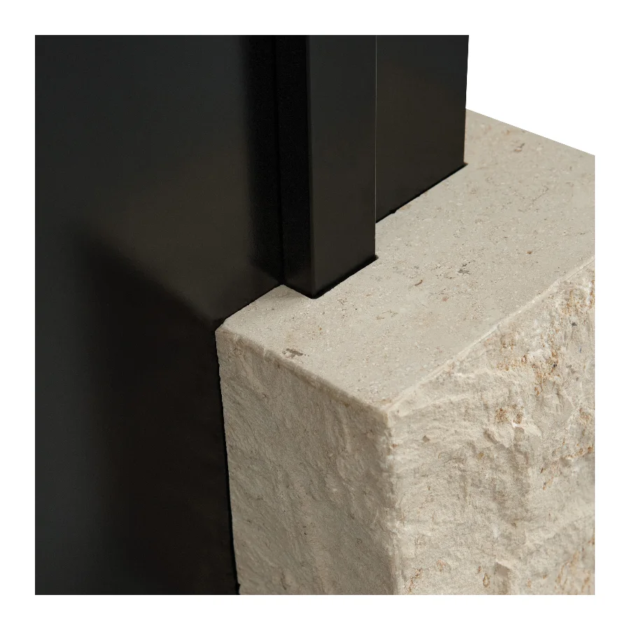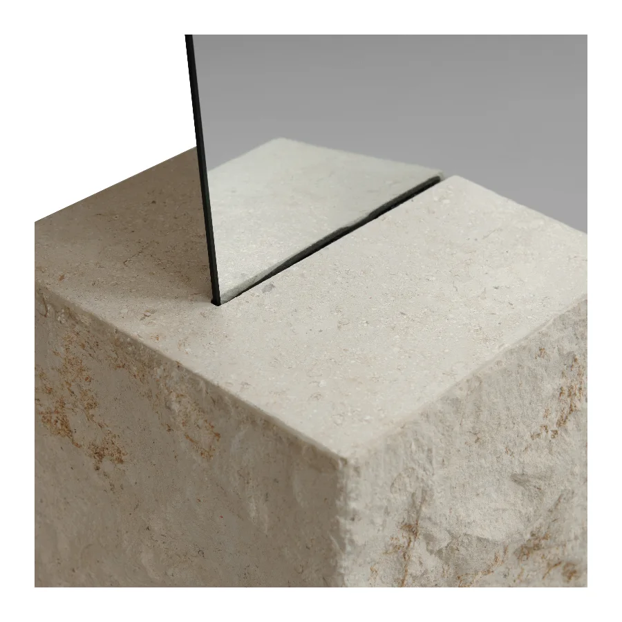 Mirror & Limestone: This piece combines two contrasting materials: mirror glass and limestone. The mirror is made from high-quality reflective glass that provides clear, accurate imaging and a smooth, polished surface, offering a refined and modern aesthetic. It pairs with limestone, a natural sedimentary stone known for its soft texture, matte finish, and subtle mineral variations. Each limestone element carries unique tonal shifts and organic markings, giving the piece a grounded, sculptural presence through the stone’s natural weight and character. Together, these materials create a balanced expression that blends the precision of glass with the tactile, elemental qualities of stone.