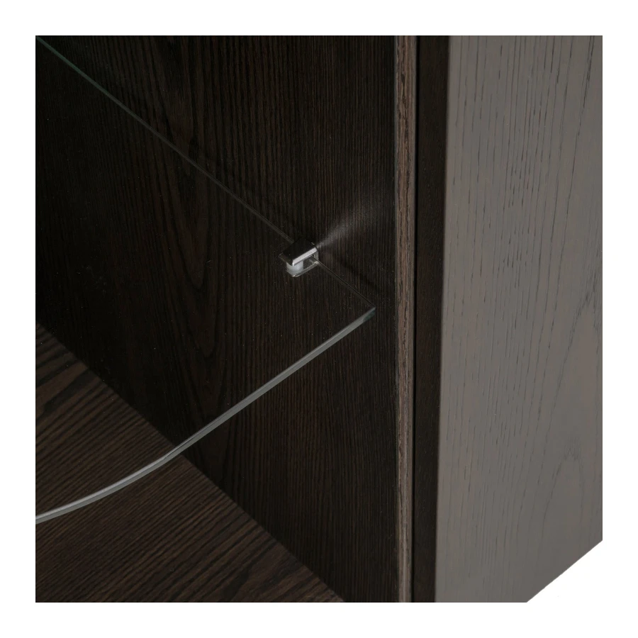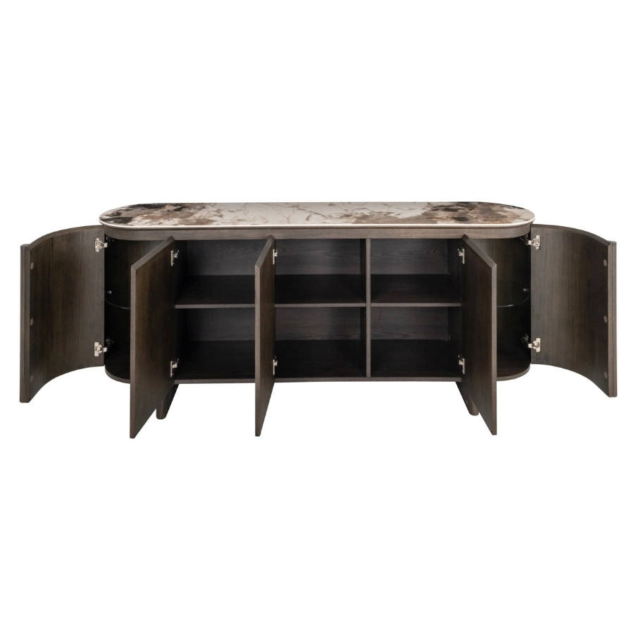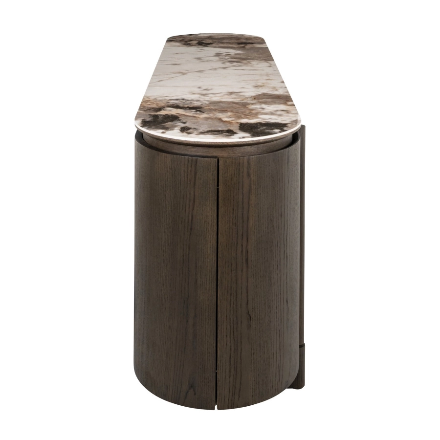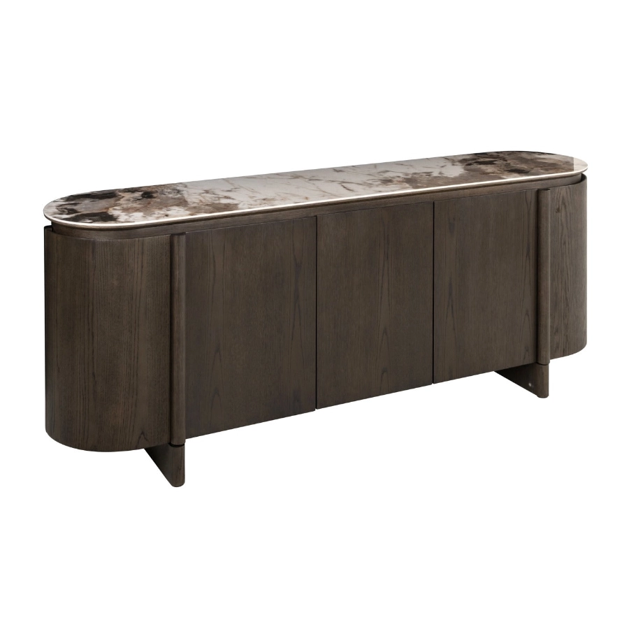 Its distinctive vertical detailing in dark oak veneer is paired with a smooth ceramic top, offering a refined contrast of texture and tone. Rich brown hues and clean architectural lines create a harmonious balance of warmth and elegance. The Langford Sideboard embodies contemporary luxury and timeless style, making it a distinguished addition to any space.