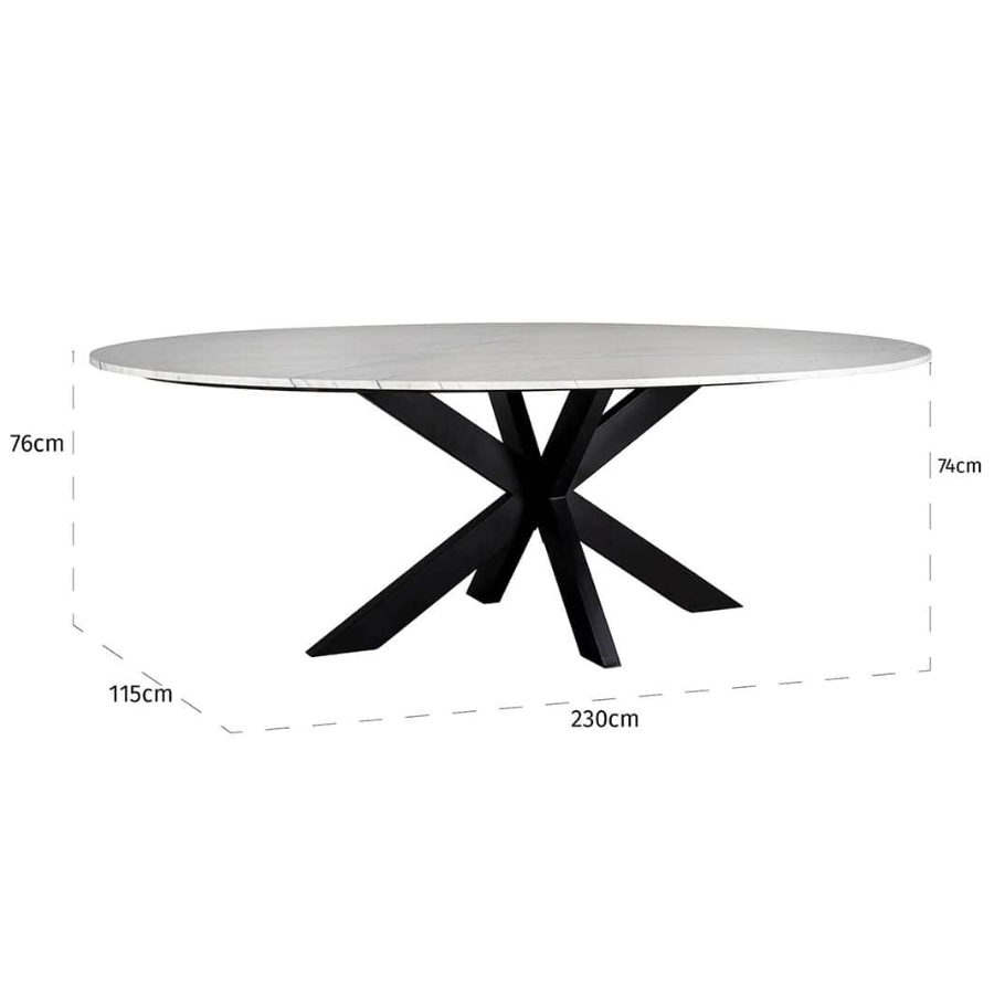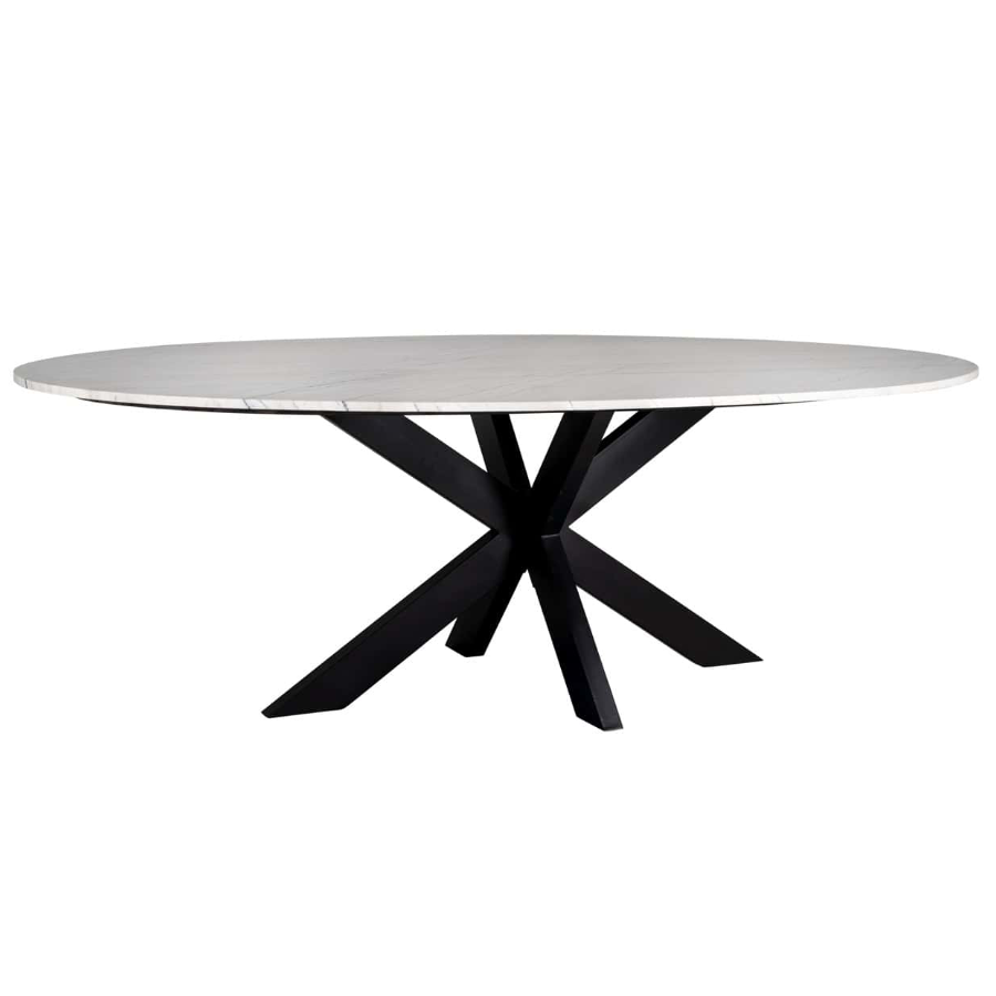 An elegant combination of black and white, it features a beautiful oval tabletop made from luxurious Carrara marble and a crossed iron base. Radiating contemporary style from the very first instant, a sophisticated dining experience is all but assured. From modern to traditional, the Lexington Dining Table will elevate in just about setting. Why not pair it with something from our stunning range of dining chairs for an elaborate finish?