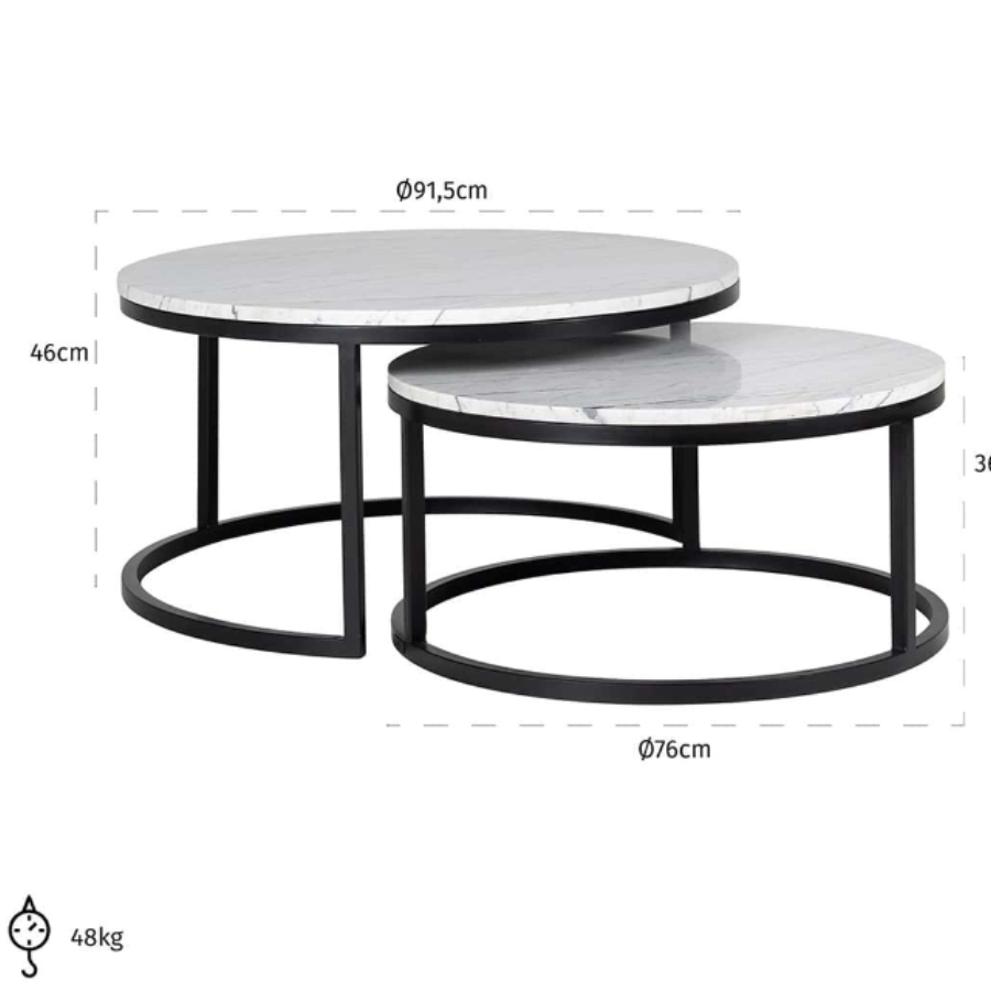 Table one: 91.5 cm (Ø) x 46 cm (H)