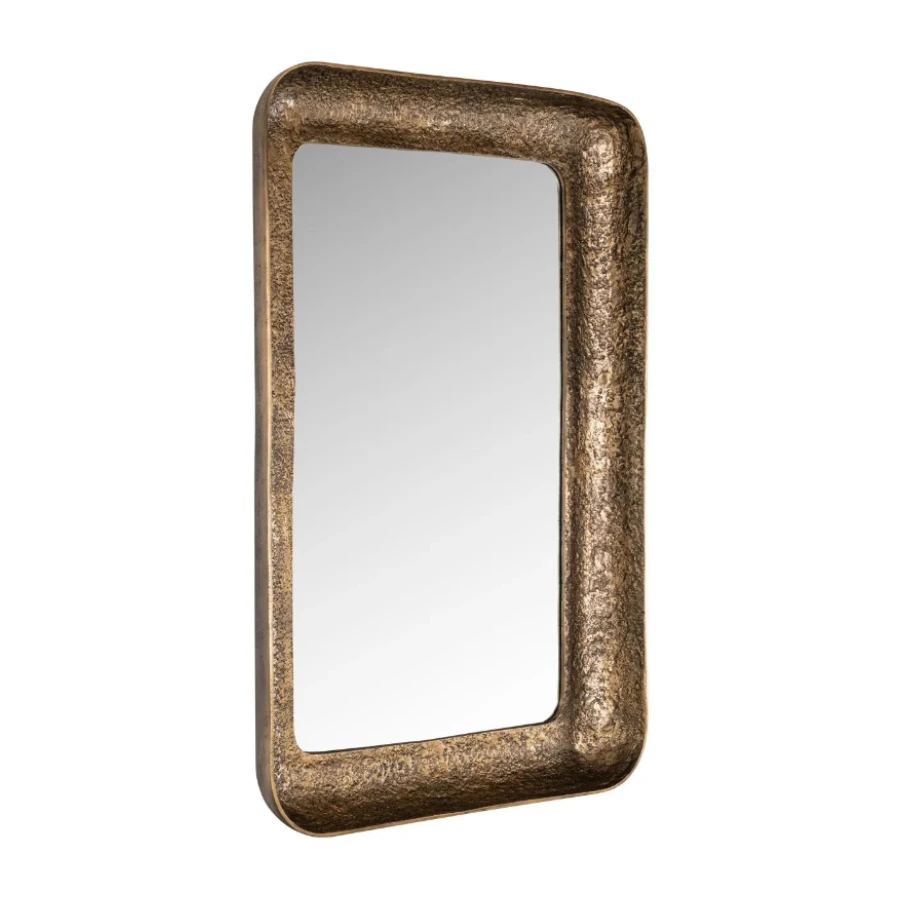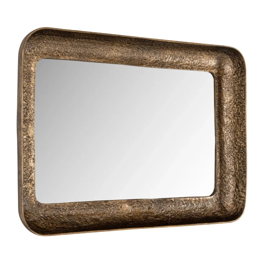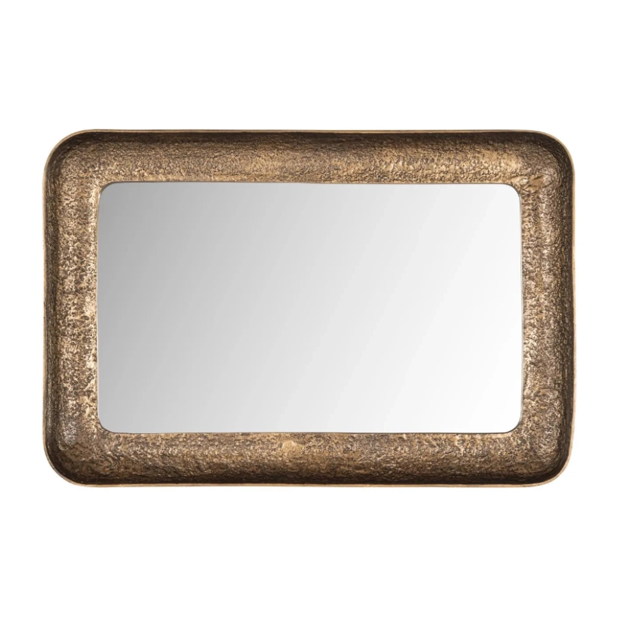 Mirror Loan has a rectangular shape with a wide, antique brass frame.