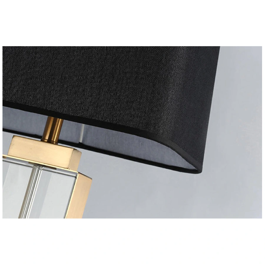 It features a brass and crystal stand, complimented by a black shade with gold lining.