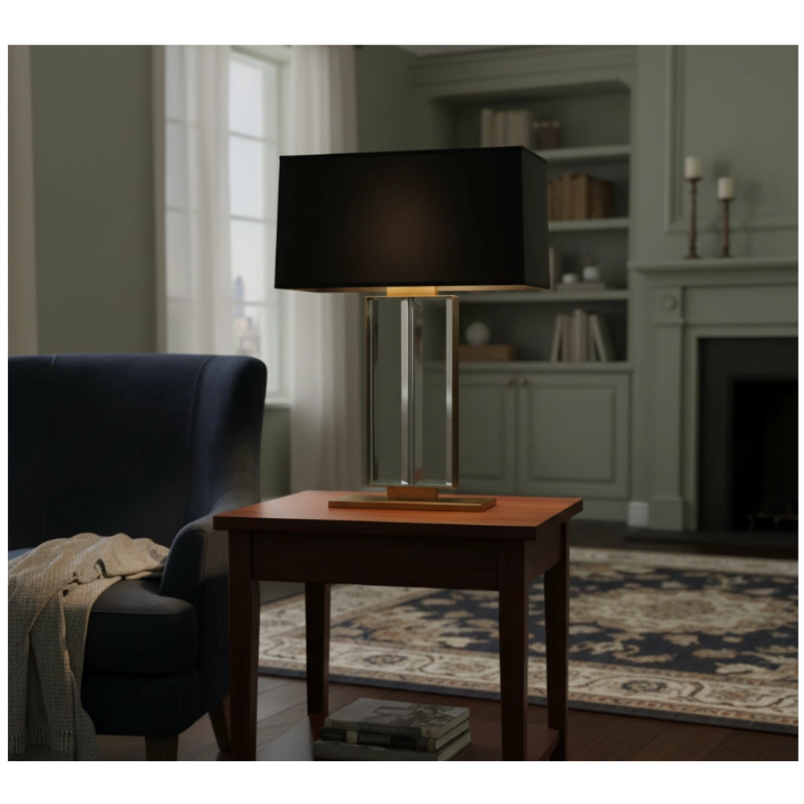 Its sleek, angular base is made from a combination of gleaming brass metal and sparkling crystal which come together for a lovely contrast, and it is robust enough to be a lasting addition to your interior. An elegant black fabric shade completes the look for a flawless aesthetic that will boost your space with ease. A captivating addition to your room of choice, the London Table Lamp will illuminate your space with its warm light.