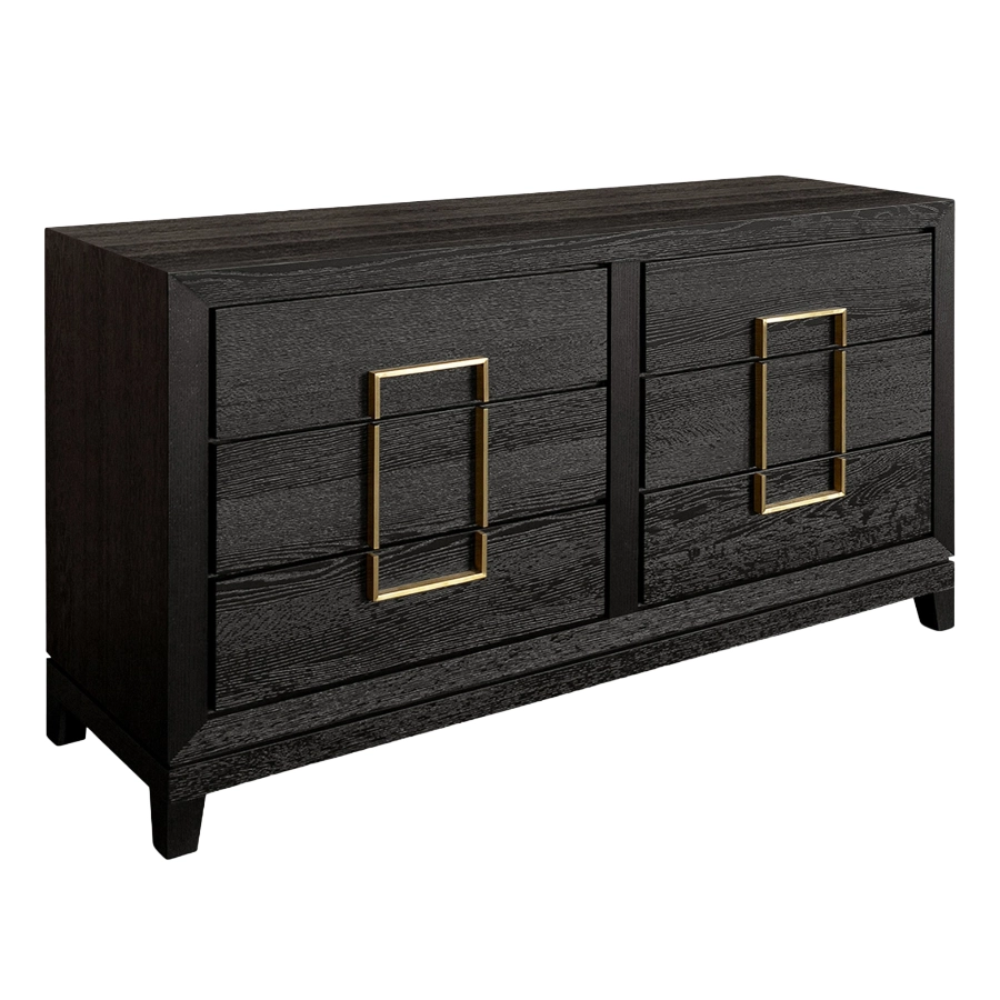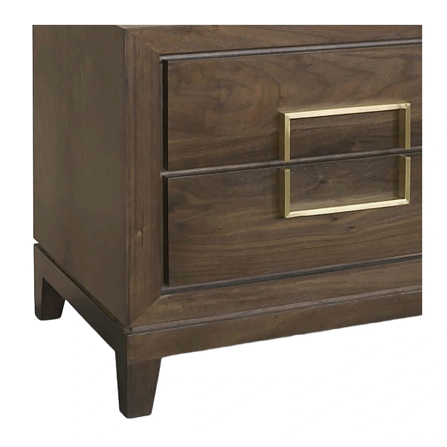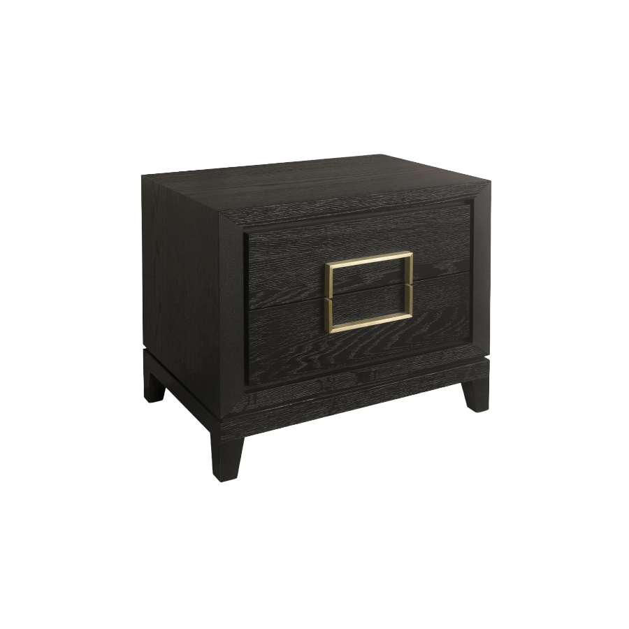The Lucca 2-Drawer Bedside Cabinet comes in a walnut veneer and has brass handles in a striking rectangular shaped design.