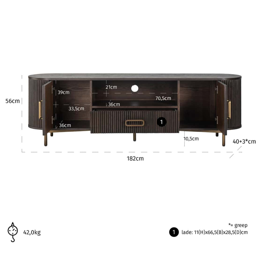 The Luxor TV cabinet, with two doors and one drawer, combines style and practical convenience.