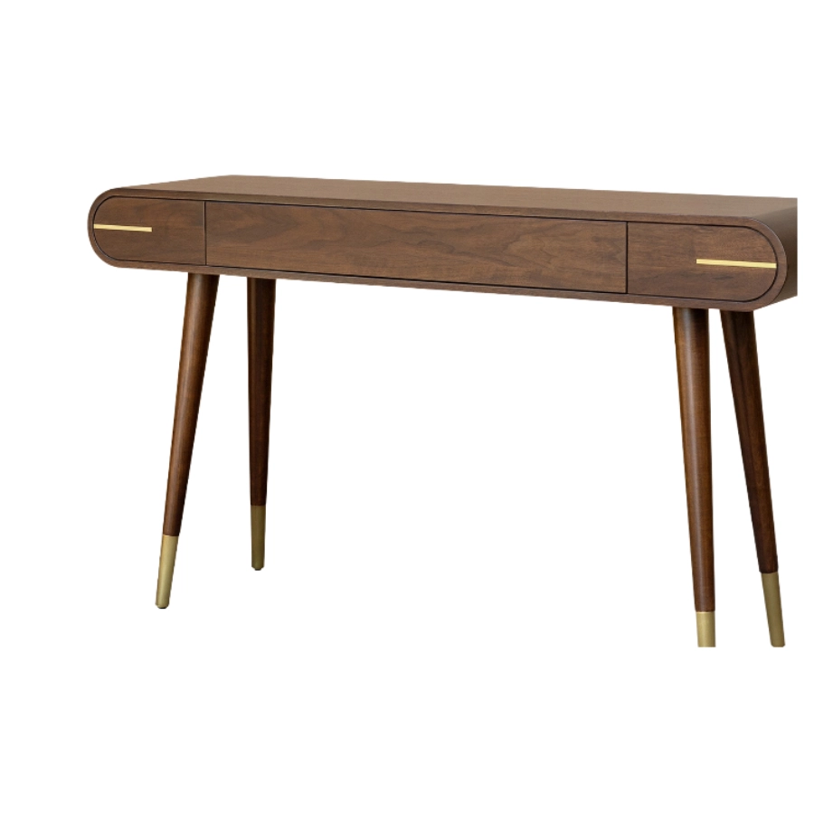 The Malibu Console Table is a sophisticated accent piece finished in a premium natural walnut veneer with striking brass features.